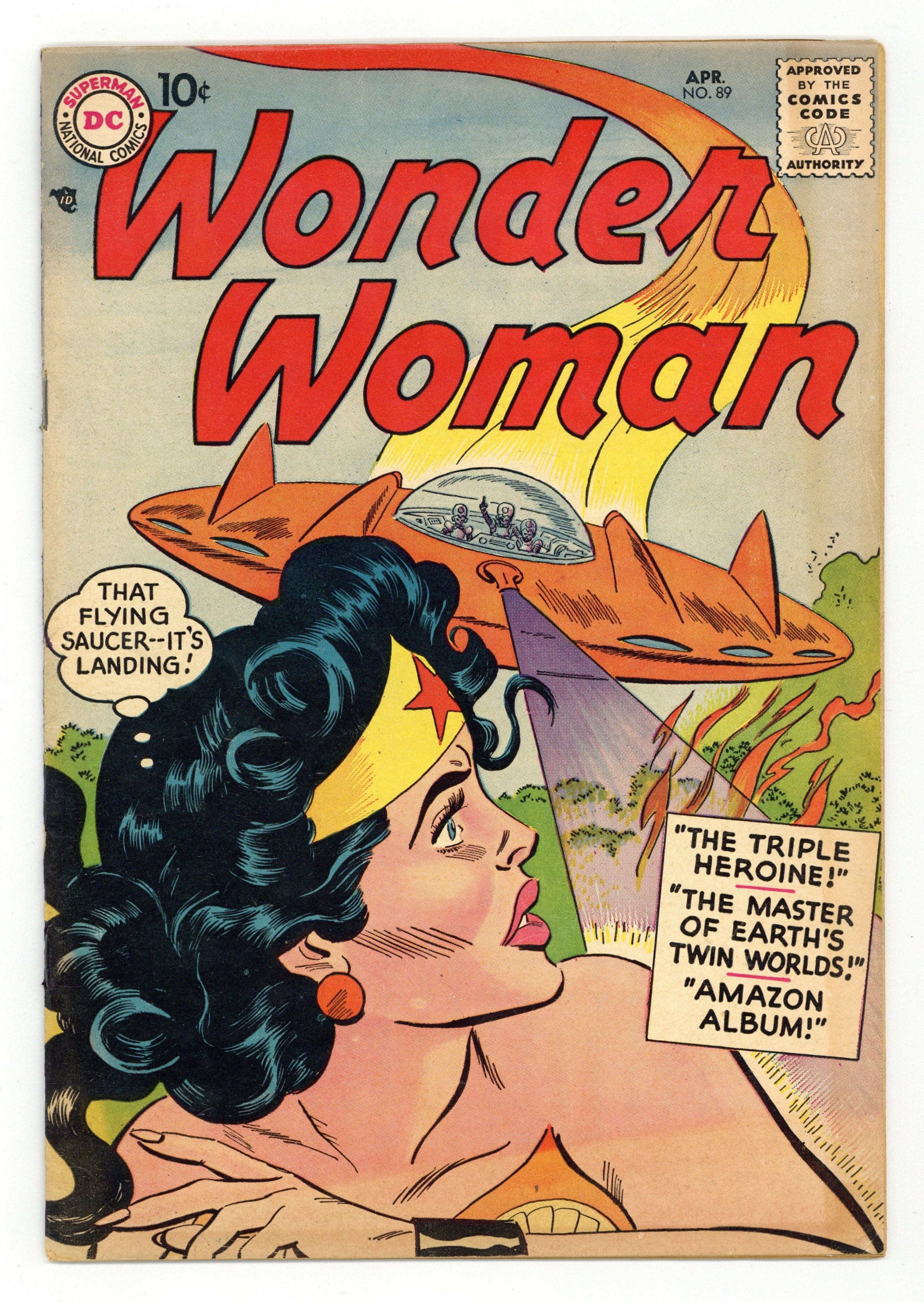 Cover pencils by Irv Novick, inks by Mike Esposito. "The Master of Earth's Twin World!", script by Robert Kanigher, art by Harry G. Peter; Every time Wonder Woman turns on a light, she is transported to a parallel world, where a diabolical villain has prepared deadly traps. "The Amazon Album!", script by Robert Kanigher, art by Harry G. Peter; A young student finds it difficult to take pictures of Wonder Woman in action. "The Triple Heroine!", script by Robert Kanigher, art by Harry G. Peter; Alien invaders attack humans to determine their fortitude, not realizing their targets - Wonder Woman and Diana Prince - are the same person. 36 pages, Full Color. Cover price $0.10.