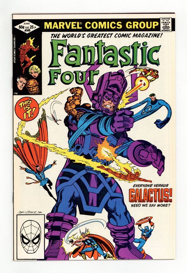 Direct Edition. "Shall Earth Endure?" Part 2 of 3. Script and Art by John Byrne. Cover by John Byrne. Guest-starring the Avengers and Doctor Strange. The situation has come down to this...the Fantastic Four, the thunder god, the golden avenger, the star-spangled avenger, the winsome Wasp, and the Master of the Mystic Arts vs. Galactus, the Devourer of Worlds...for the life of the Earth! Everything is on the line as the blockbuster battle rages on top of the World Trade Center! Will the 'Ravager of Worlds' finally add the Earth to his list of conquests, or can the greatest heroes on the planet do the impossible: defeat Galactus? Cameo appearances by Daredevil and Spider-Man. 36 pgs. Cover price $0.60.
