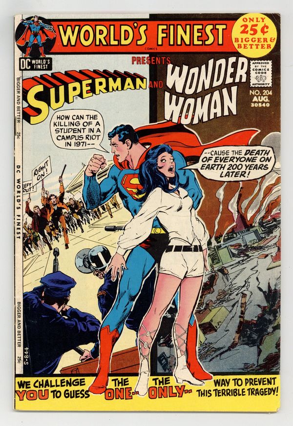 52-page giant. Cover art by Neal Adams. Journey to the End of Hope! starring Superman and Wonder Woman, script by Dennis O'Neil, pencils by Dick Dillin, inks by Joe Giella. The Guardians of the Clockwork Universe! starring Captain Comet, script by John Broome, pencils by Murphy Anderson, inks by Sy Barry. The Rogue of 1000 Ropes! starring Green Arrow, script by Ed Herron, art by George Papp. 52 Pages, Full Color. Cover price $0.25.