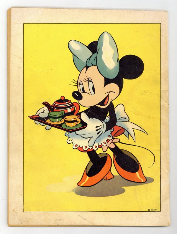 Cover by Al Taliaferro. Stories and art by Floyd Gottfredson, Ted Thwaites, Ted Osborne, Bob Karp, Hank Porter, Ferdinand Horvath and Al Taliaferro. Sometimes listed as Vol. 1, #10. The long-running vehicle for Disney character comics featured early work by Carl Barks, the legendary Good Duck Artist. In a classic Floyd Gottfredson story from the Mickey Mouse comic strip, Mickey is asked to stand in for his lookalike, the irresponsible King of Medioka. In another Gottfredson story, Mickey is a secret agent seeking stolen plans. A biography of Minnie Mouse that predicts her marriage to Mickey. Cracked Ice; Its the Law; Revenge Is Sweet; It Oughta Be a Bumper Crop; Goofy Knows the Ropes; Slightly Sidetracked; Mickeys Garden; Silly Symphony; Donalds Camera; A Frame For Minnie; Independence Day; He Can Dream, Cant He!; The Watch-Man; Mickeys Birthday Party; Mickey Mouse in the Secret Service; Mickeys Rival; Minnie Mouse. 64 pages, Full Color. Cover price $0.10.