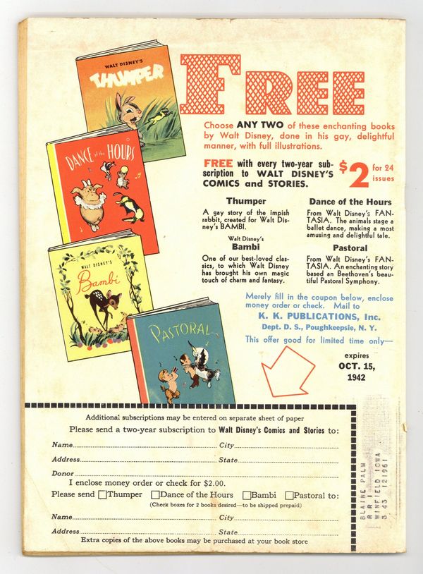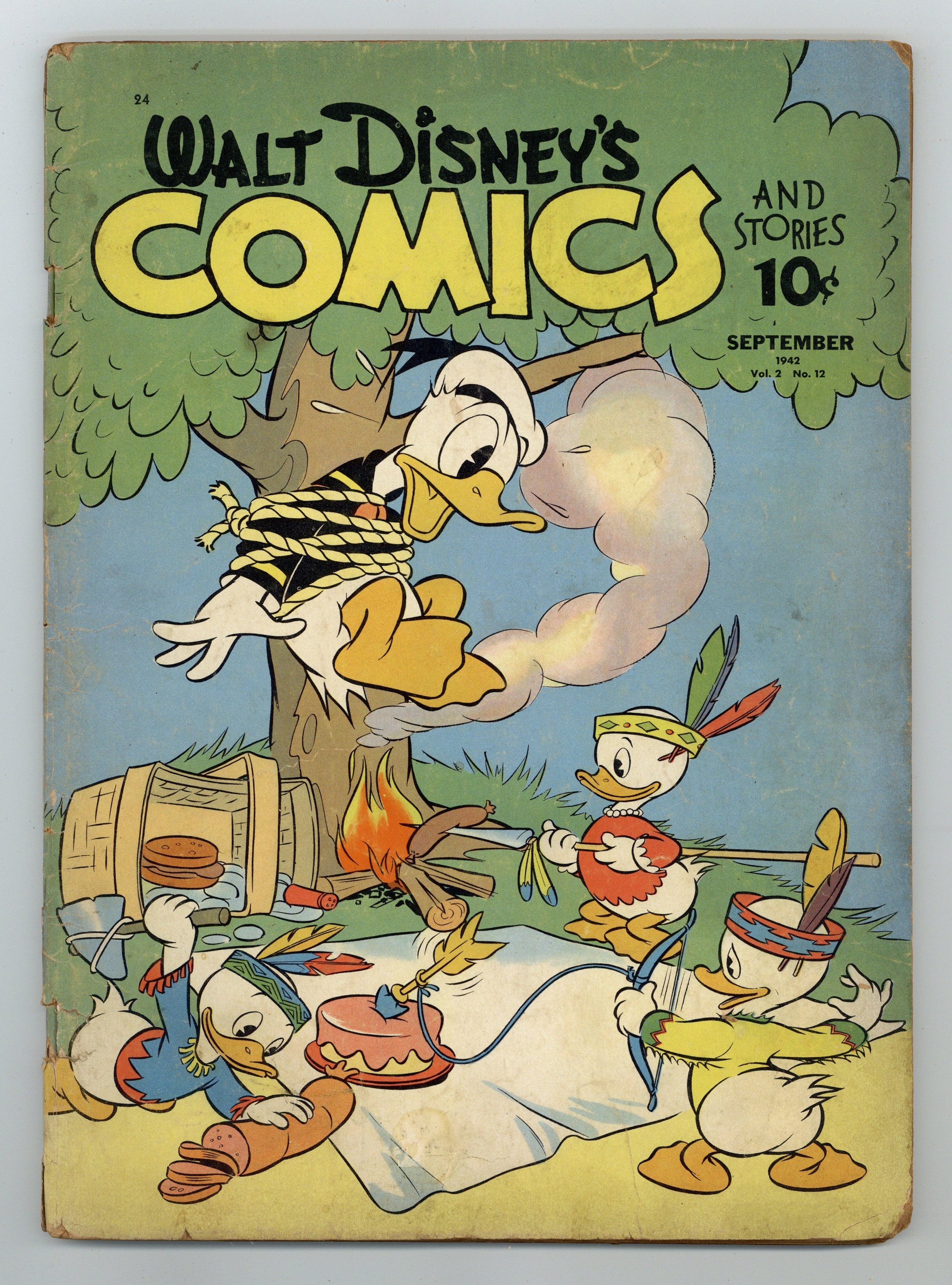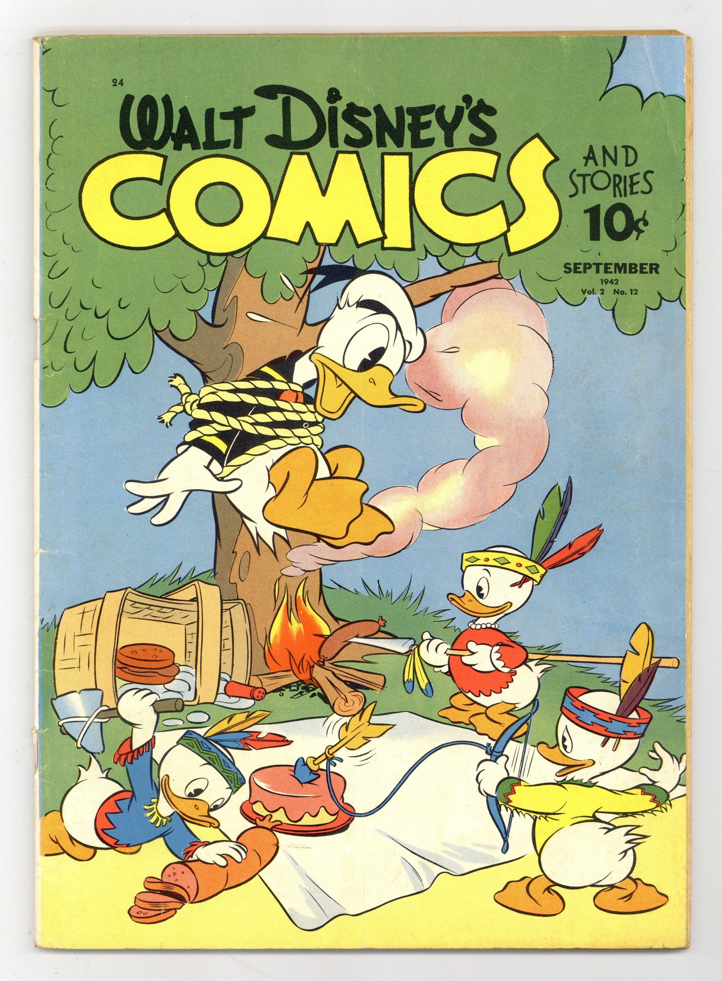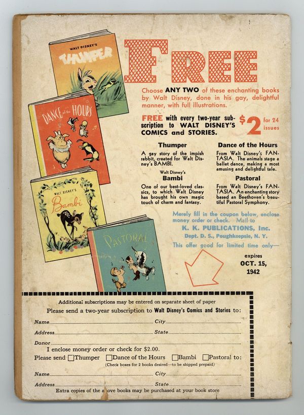 Tags: Disney Ducks & MicePublished Sep 1942 by Dell/Gold Key.$135.00- Centerfold detached at one staple. Cover loose at one staple.