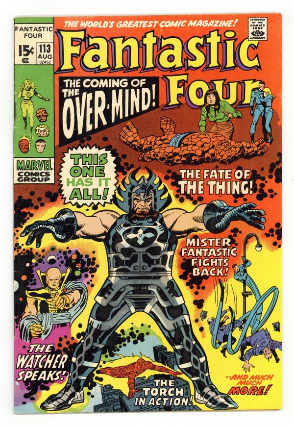 Tags: Fantastic Four$16.00"The Power of the Over-Mind!" Part 1 of 4. Script by Stan Lee. Pencils by John Buscema. Inks by Joe Sinnott. Cover by John Buscema and John Verpoorten. The Thing has gone down to defeat at the hands of the Incredible Hulk. And now Reed, Sue, and Johnny are left to pick up the pieces and administer first aid to Ben Grimm. But while the trio transports the Thing to safety, more problems arise! The police want to arrest the FF, angry citizens want to storm the Baxter Building, and the Watcher wants to talk! Whew, there's no rest for the weary! Fortunately though, the Watcher keeps it brief: "Beware the Over-Mind!" Wow, cryptic words indeed! First appearance of the Over-Mind. Cameo appearances by Bruce Banner, Agatha Harkness, Alicia Masters, Franklin, and New York Mayor John Lindsay. 36 pages Cover price $0.15.