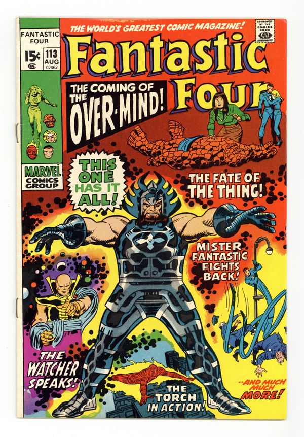 "The Power of the Over-Mind!" Part 1 of 4. Script by Stan Lee. Pencils by John Buscema. Inks by Joe Sinnott. Cover by John Buscema and John Verpoorten. The Thing has gone down to defeat at the hands of the Incredible Hulk. And now Reed, Sue, and Johnny are left to pick up the pieces and administer first aid to Ben Grimm. But while the trio transports the Thing to safety, more problems arise! The police want to arrest the FF, angry citizens want to storm the Baxter Building, and the Watcher wants to talk! Whew, there's no rest for the weary! Fortunately though, the Watcher keeps it brief: "Beware the Over-Mind!" Wow, cryptic words indeed! First appearance of the Over-Mind. Cameo appearances by Bruce Banner, Agatha Harkness, Alicia Masters, Franklin, and New York Mayor John Lindsay. 36 pages Cover price $0.15.