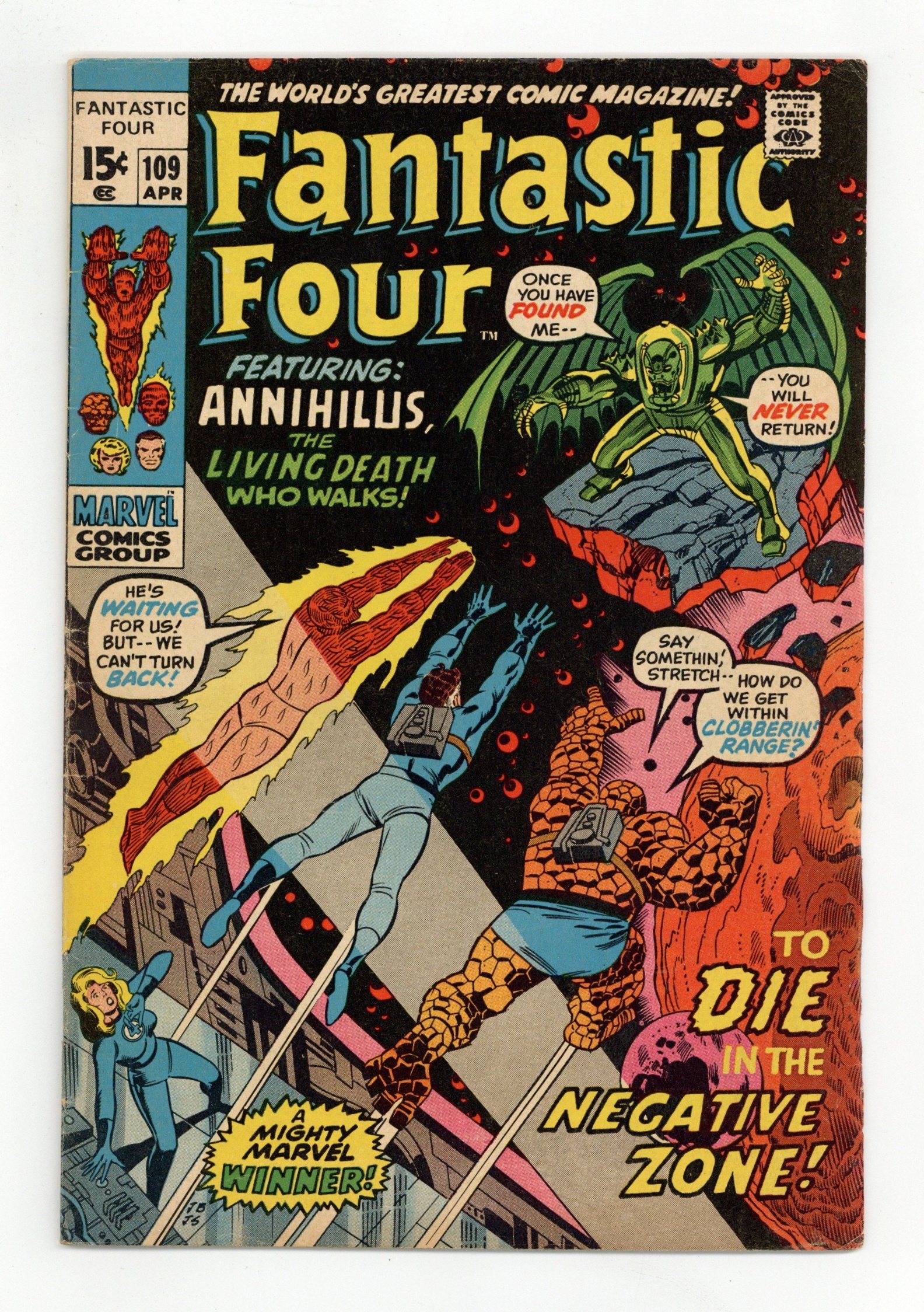 "Death in the Negative Zone!" Script by Stan Lee. Pencils by John Buscema. Inks by Joe Sinnott. Cover by John Buscema and Joe Sinnott. Janus wants to conquer the Negative Zone! Annihilus wants to conquer the Earth! And the Fantastic Four are caught in the middle! But before either the Nega-Man or Annihilus can reach their destinations, they must do battle against one another first! Meanwhile Reed, Ben, and Johnny cross over into the antimatter universe to thwart Annihilus' plans! However, the Lord of the Negative Zone is virtually unbeatable in his kingdom! It's a super showdown: the Thing, Human Torch, and Mr. Fantastic vs. Annihilus! Cameo appearance by Agatha Harkness. (Note: The letters page contains a statement of ownership: average print run 518,737; average paid circulation 285,639.) 36 pages Cover price $0.15.