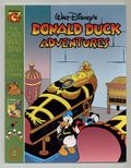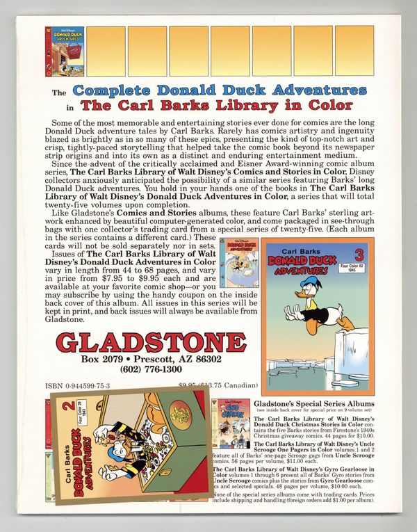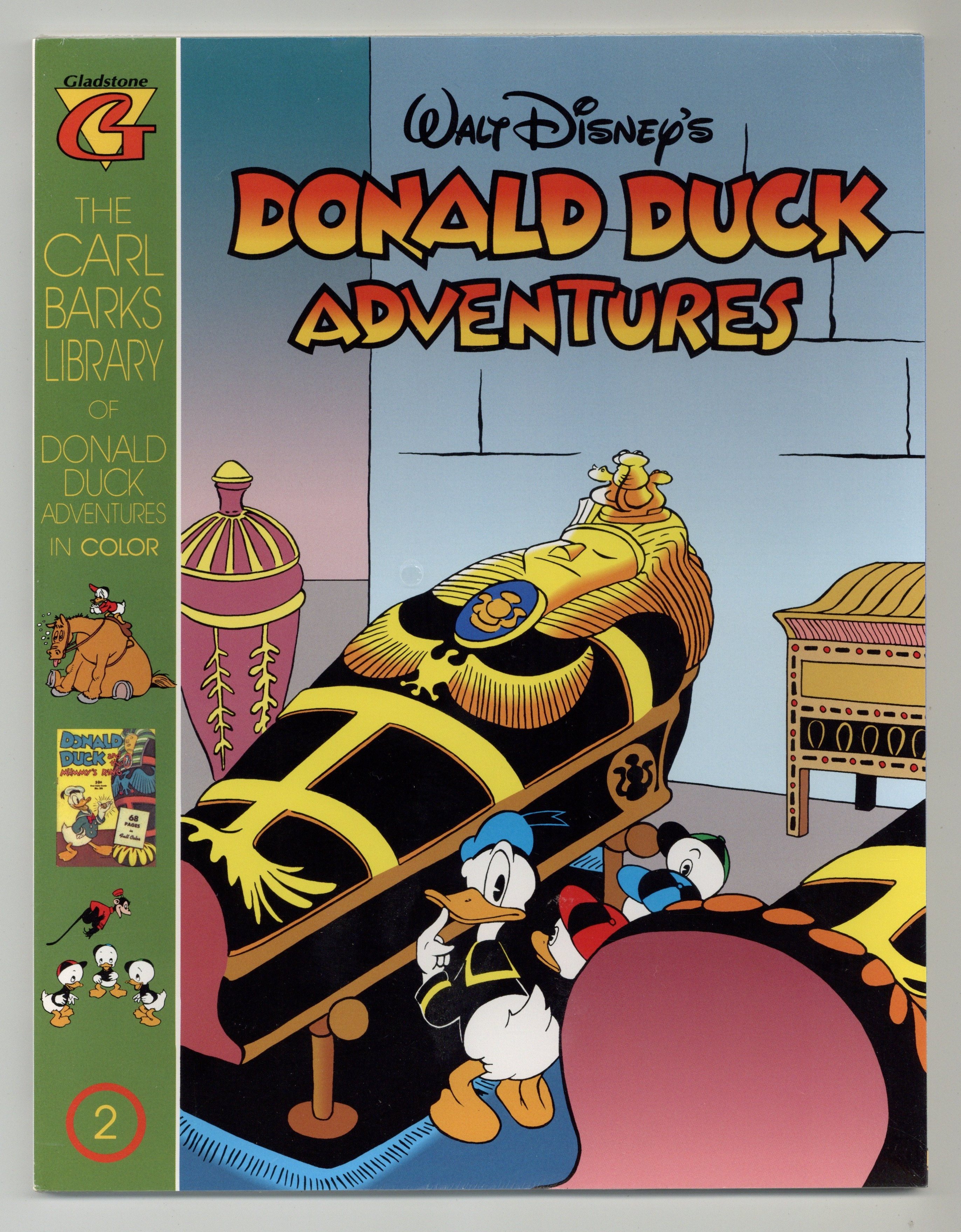 Cover art by Carl Barks. "Donald Duck and the Mummy's Ring," script and art by Carl Barks; Donald, Dewey, and Louie pursue a kidnapped Huey and a stolen mummy to Egypt; from Four Color (Dell, 1942 series) #29. "The Hard Loser," script and art by Carl Barks; Donald and the nephews enter a screwball horse race. "Too Many Pets," script and art by Carl Barks; The nephews adopt an organ grinder's monkey and thwart a spy. Ringing In Some Changes article by Geoffrey Blum; Details the differences in three pages between the original publication of "Mummy's Ring" and Uncle Scrooge and Donald Duck (1965); Barks copied the pages in 1965 and there are minor differences; The three redone pages are reproduced in black and white in one-fourth page size. Originally distributed sealed with trading card insert. Trading card may or may not be present. Softcover, 8 1/2-in. x 11-in., 56 pages, full color. Cover price $7.95.