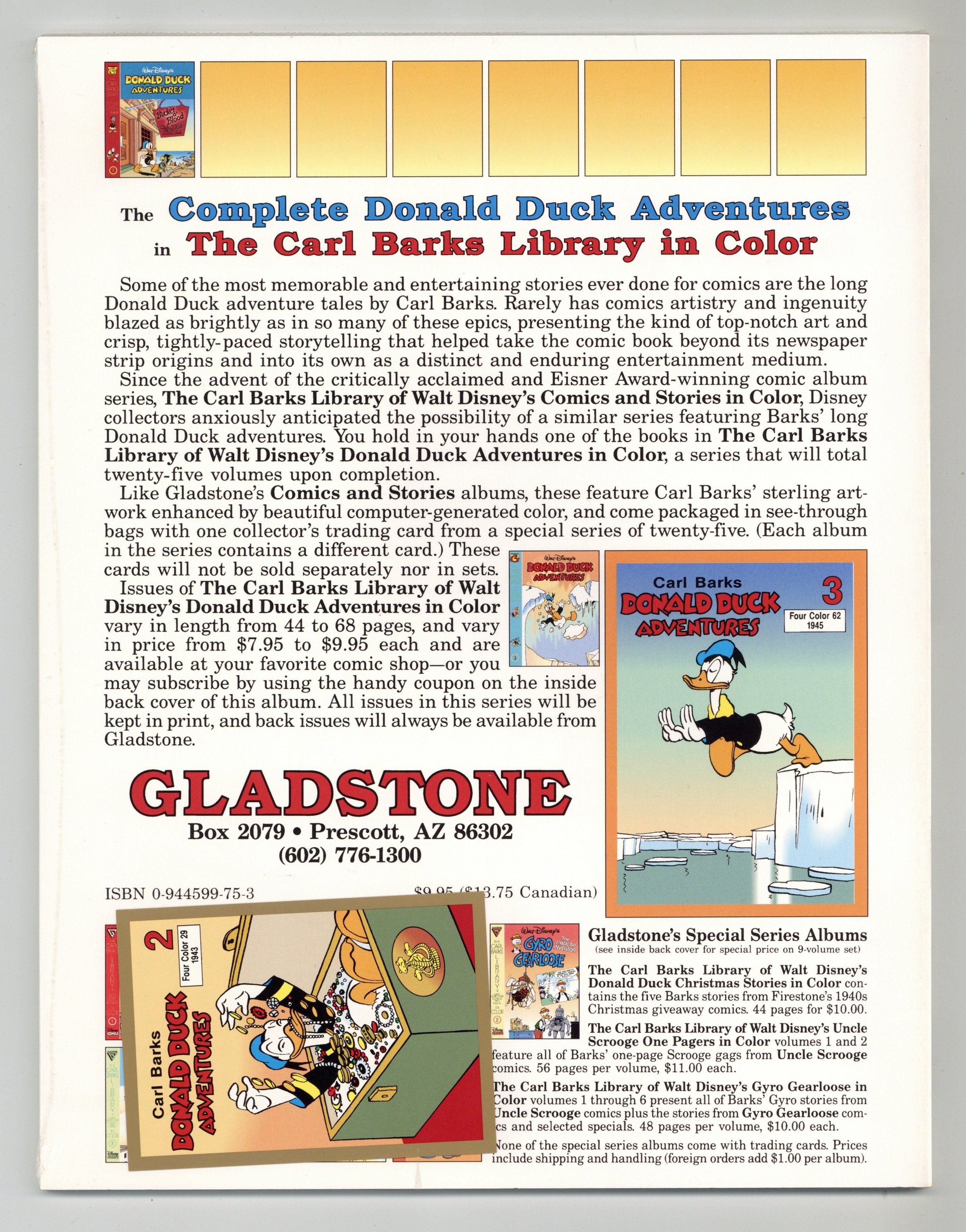 $12.00Cover art by Carl Barks. "Donald Duck and the Mummy's Ring," script and art by Carl Barks; Donald, Dewey, and Louie pursue a kidnapped Huey and a stolen mummy to Egypt; from Four Color (Dell, 1942 series) #29. "The Hard Loser," script and art by Carl Barks; Donald and the nephews enter a screwball horse race. "Too Many Pets," script and art by Carl Barks; The nephews adopt an organ grinder's monkey and thwart a spy. Ringing In Some Changes article by Geoffrey Blum; Details the differences in three pages between the original publication of "Mummy's Ring" and Uncle Scrooge and Donald Duck (1965); Barks copied the pages in 1965 and there are minor differences; The three redone pages are reproduced in black and white in one-fourth page size. Originally distributed sealed with trading card insert. Trading card may or may not be present. Softcover, 8 1/2-in. x 11-in., 56 pages, full color. Cover price $7.95.