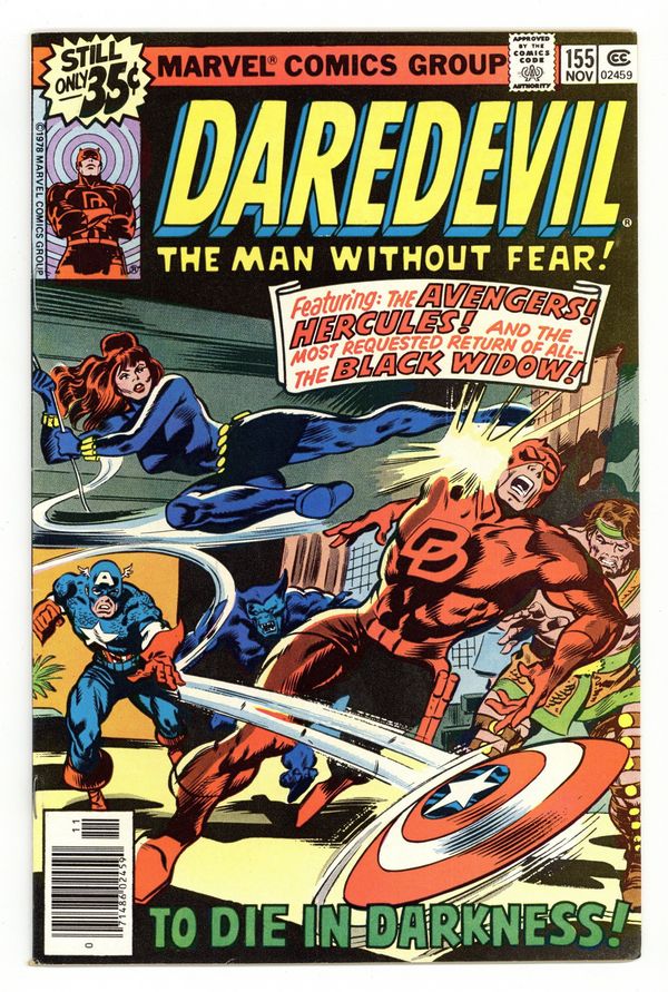 Cover pencils by Gene Colan, inks by Frank Springer. The Avengers (Captain America, the Black Widow, the Beast) and Hercules guest stars in The Man Without Fear?, script by Roger McKenzie, pencils by Frank Robbins, inks by Frank Springer; DD starts getting mysterious headaches that interfere with his daily activities; Matt hires Becky as his new secretary; Daredevil invades Avenger's mansion to confront a visiting Black Widow; Death-Stalker appearance. 36 pgs. Cover price $0.35. Cover price $0.35.