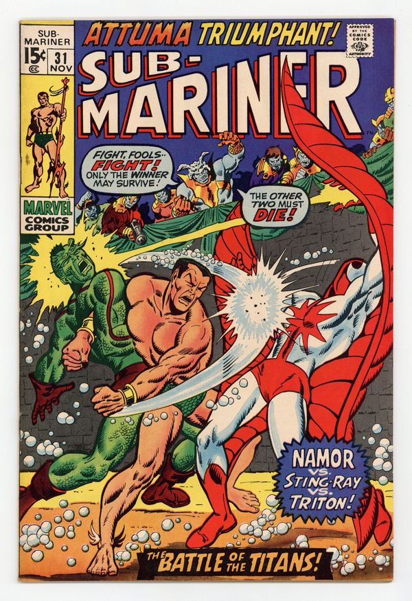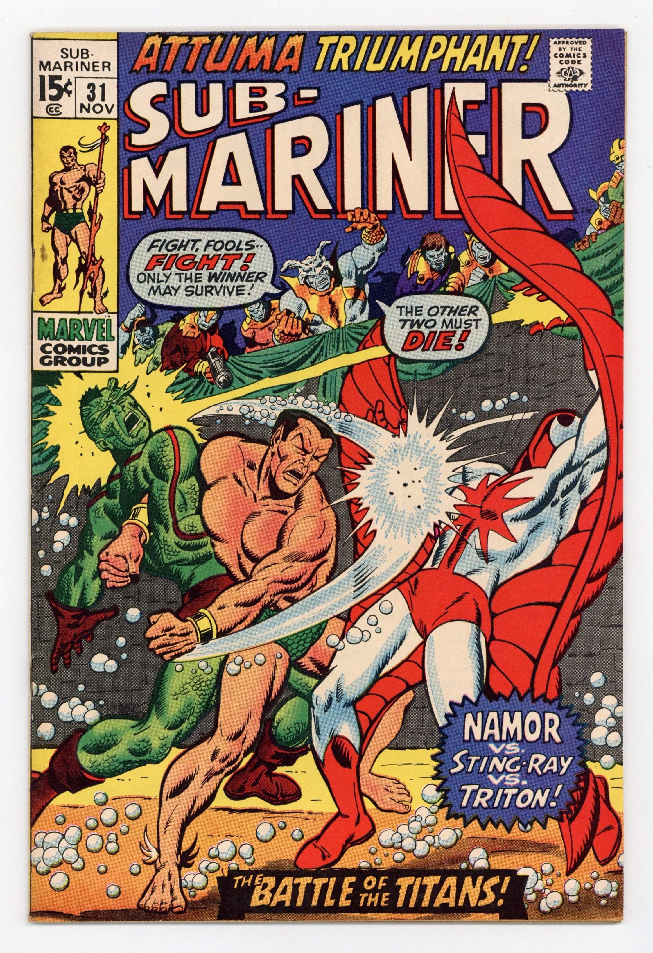 Cover art by Sal Buscema. "Attuma Triumphant," script by Roy Thomas, art by Sal Buscema; Triton and Stingray meet each other as they investigate a ship that was apparently sunken by Atlanteans in the name of Namor; Namor, also interested in this ship, confronts them and a misunderstanding leads to a battle; Attuma, who set the trap, catches them off guard and captures them; Attuma is using human prisoners and a captured Atlantean scientist to burrow underneath Manhattan in hopes of launching a surprise assault; Namor, Stingray, and Triton free themselves and overwhelm Attuma and bring an end to his scheme. 36 pgs., full color. $0.15. Cover price $0.15.