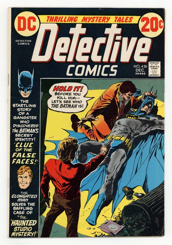 Tags: Batman$17.50Cover by Jim Aparo. "Clue of the False Faces!", script by Frank Robbins, pencils by Bob Brown, inks by Nick Cardy; After receiving a blow to the head, Batman awakens to find that the unfamiliar face beneath his mask belongs to a criminal. "The Haunted Studio Mystery!," script by E. Nelson Bridwell, art by Dick Giordano; the Elongated Man and Sue Dibny encounter thieves disguised as famous actors. Letter to the editor from Guy Lillian III. 36 pgs., full color. $0.20. Cover price $0.20.