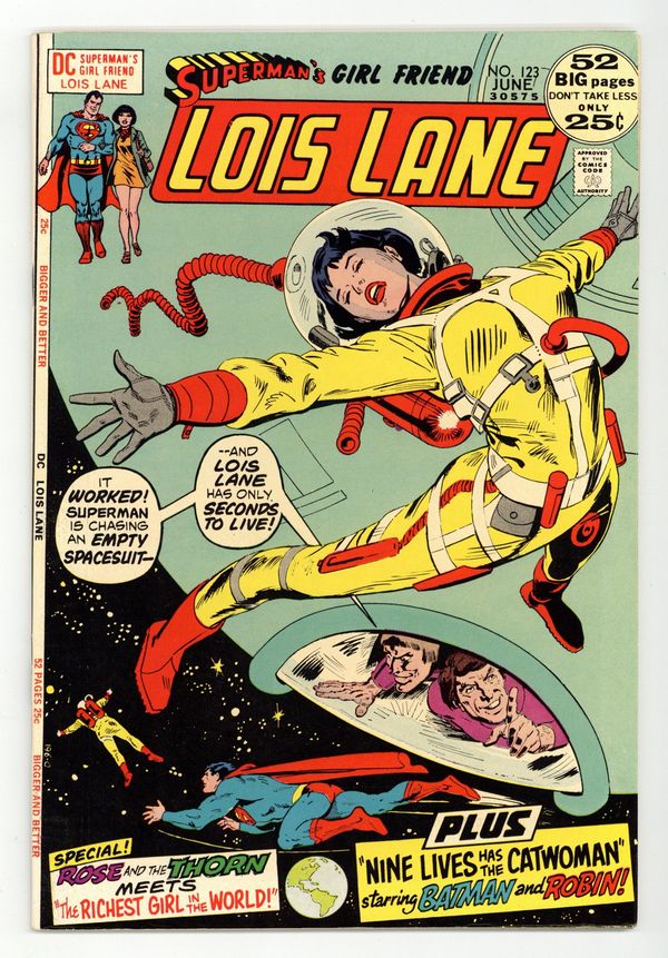 Cover art by Bob Oksner. The Ten Deadly Divisions of the 100, script by Cary Bates, pencils by John Rosenberger, inks by Vince Colletta and Murphy Anderson (Superman heads only); Superman and Lois learn from the recovered super-computer K.A.R.L. that the 100 is constantly replacing its arrested members. The Richest Girl in the World!, art by Don Heck; As Rose is looking for a job, she stumbles upon the kidnapping of a fashion designer and the Thorn must stop the crime. Nine Lives Has the Catwoman!, script by Bill Finger, pencils by Bob Kane, inks by Ray Burnley; The Catwoman escapes from jail and attempts to enhance her reputation by claiming that she really does have nine lives, like a cat, and can't be killed (reprinted from Batman #35). 52 Pages, Full Color. Cover price $0.25.