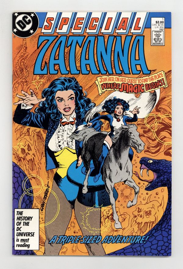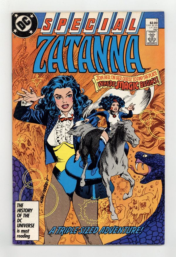 Tags: Zatanna$15.00"Summoning!" Written by Gerry Conway. Art by Gray Morrow. Join Zatanna on her harrowing quest to find the source where magic begins! NOTE: The events of this tale take place before Justice League of America (1960-1987 1st Series) #248-257. 64 pages, FC. NOTE: This Special was originally intended to be a 4-issue mini series but was edited down to one super-sized issue. - Odinson, Lone Star Comics Archivist Cover price $2.00.