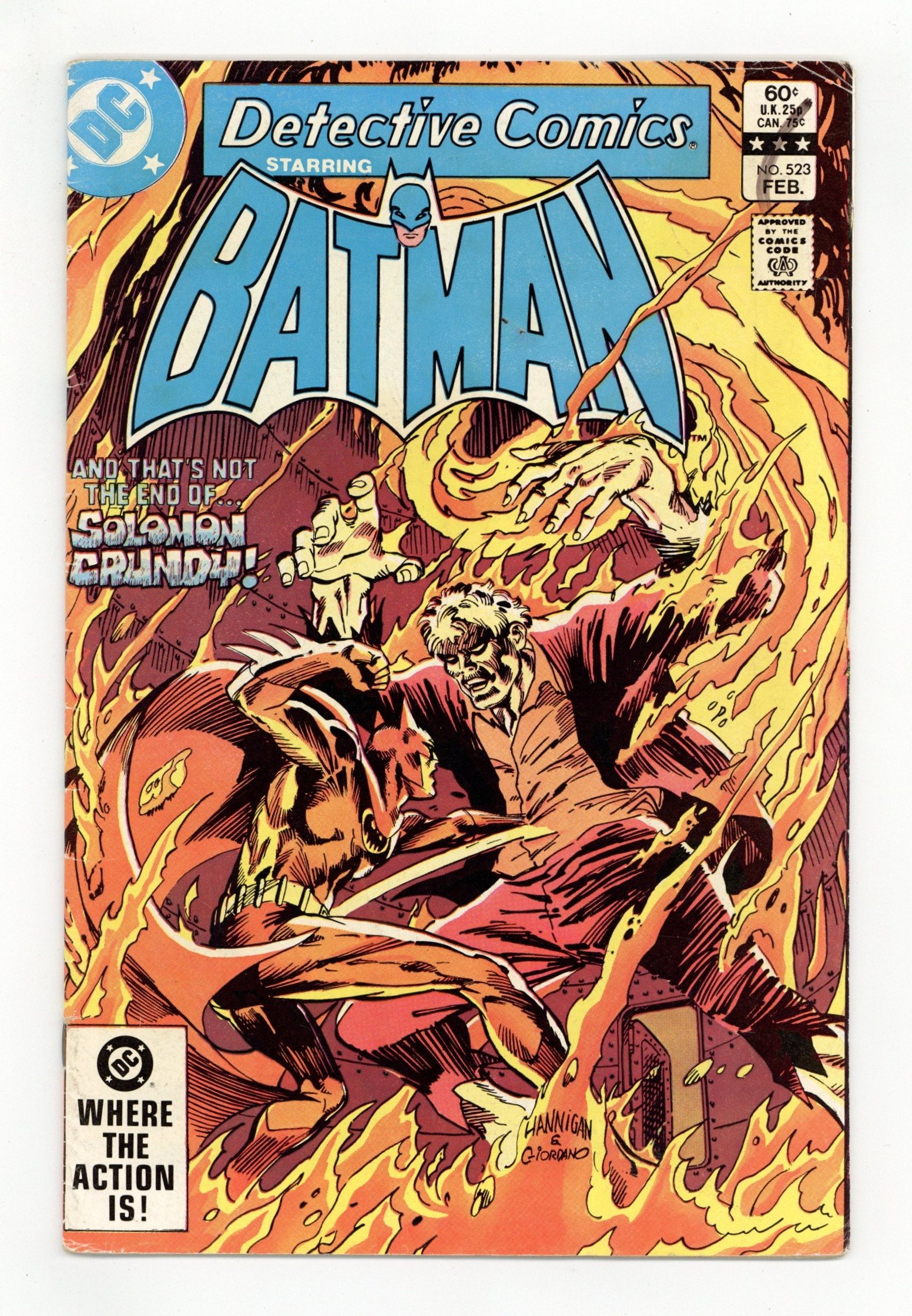 Tags: Batman, Green Arrow$28.50Cover pencils by Ed Hannigan, inks by Dick Giordano. "Inferno," script by Gerry Conway, pencils by Gene Colan, inks by Tony deZuniga; Batman learns that Solomon Grundy is haunting the sewers of Gotham City with a gang of criminals. "Mob Rule!", script by Joey Cavalieri, pencils by Irv Novick, inks by Ron Randall; After stopping a riot at the site of a strike, Green Arrow notices two men who had fought each other acting chummy and tails one of them. He discovers that the man is part of a group that intends to throw Star City into chaos and then usurp leadership, with a plot created by their adviser, Lord Machiavelli; GA reveals his presence, whereupon Machiavelli calls upon his partner, the Executrix, to battle him with twin laser-torches. Letter from T.M. Maple. 36 pgs., full color. $0.60. Cover price $0.60.