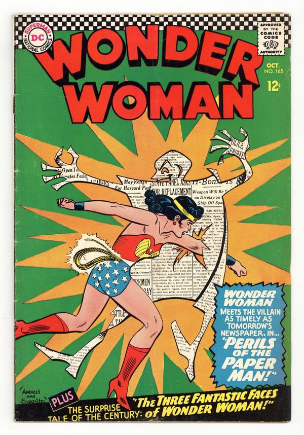 Cover pencils by Ross Andru, inks by Mike Esposito. "Perils of the Paper-Man," script by Robert Kanigher. Pencils by Ross Andru, inks by Mike Esposito; Diana Prince and Steve Trevor are at a chemical plant checking on a new process for making paper for the military when they encounter a timid factory worker named Horace, whom Diana takes pity on; Shortly afterward, Horace falls in a vat of chemicals used in making paper, and becomes a being of living paper. "The Three Fantastic Faces of Wonder Woman," script by Robert Kanigher, pencils by Ross Andru, inks by Mike Esposito; When Wonder Woman and Steve Trevor unveil what is supposed to be a statue of Wonder Woman built from copper pennies donated by her young fans, they are flabbergasted to see it has been stolen and replaced by a statue of Dr. Psycho. Letter to the editor by writer/producer Mike Uslan. 36 pages, Full Color. Cover price $0.12.