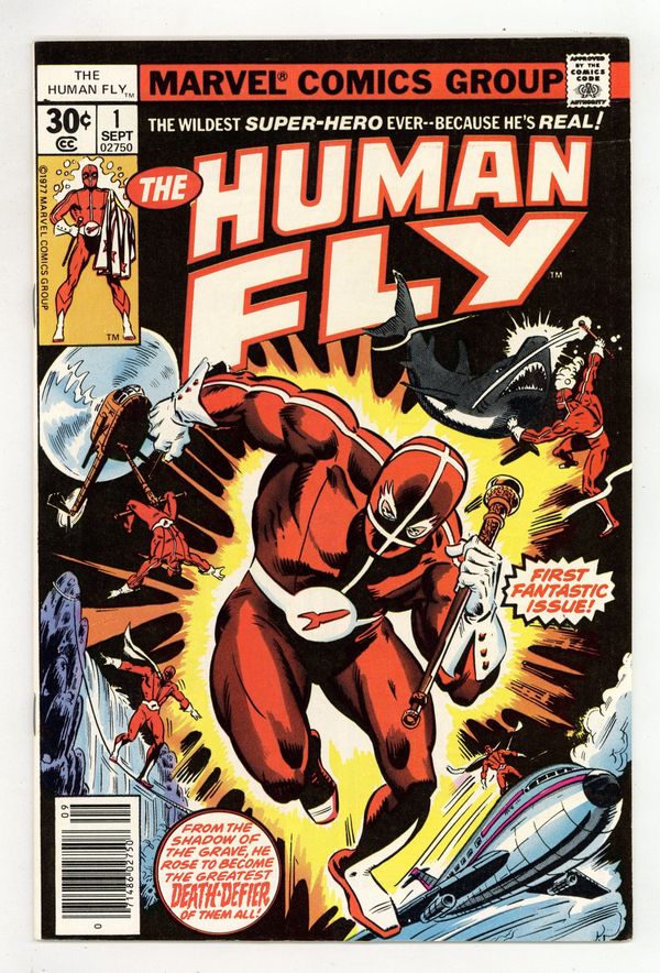 "Death-Walk!" Written by Bill Mantlo. Art by Lee Elias. Guest-starring Spider-Man. Thrill to the death-defying adventures of the Human Fly! The Human Fly is a man that was severely injured in a car crash. After a reconstructive surgery laced 60% of his skeleton with by steel, making him highly resistant to injury, the Fly now performs daredevil stunts to benefit various charities, especially those helping children with disabilities. The Human Fly is accompanied by a close knit group of allies with varying skills that assist him in his stunts and his adventures. In this first exciting adventure, the Human Fly attempt to save a jet airliner from hijackers, while it's still in the skies over Texas. Luckily, the Amazing Spider-Man is on hand to lend a hand. 32 pages, FC. NOTE: The Human Fly character, created by Bill Mantlo, is based on real-life stuntman Rick Rojatt. 1st Human Fly. Cover price $0.30.