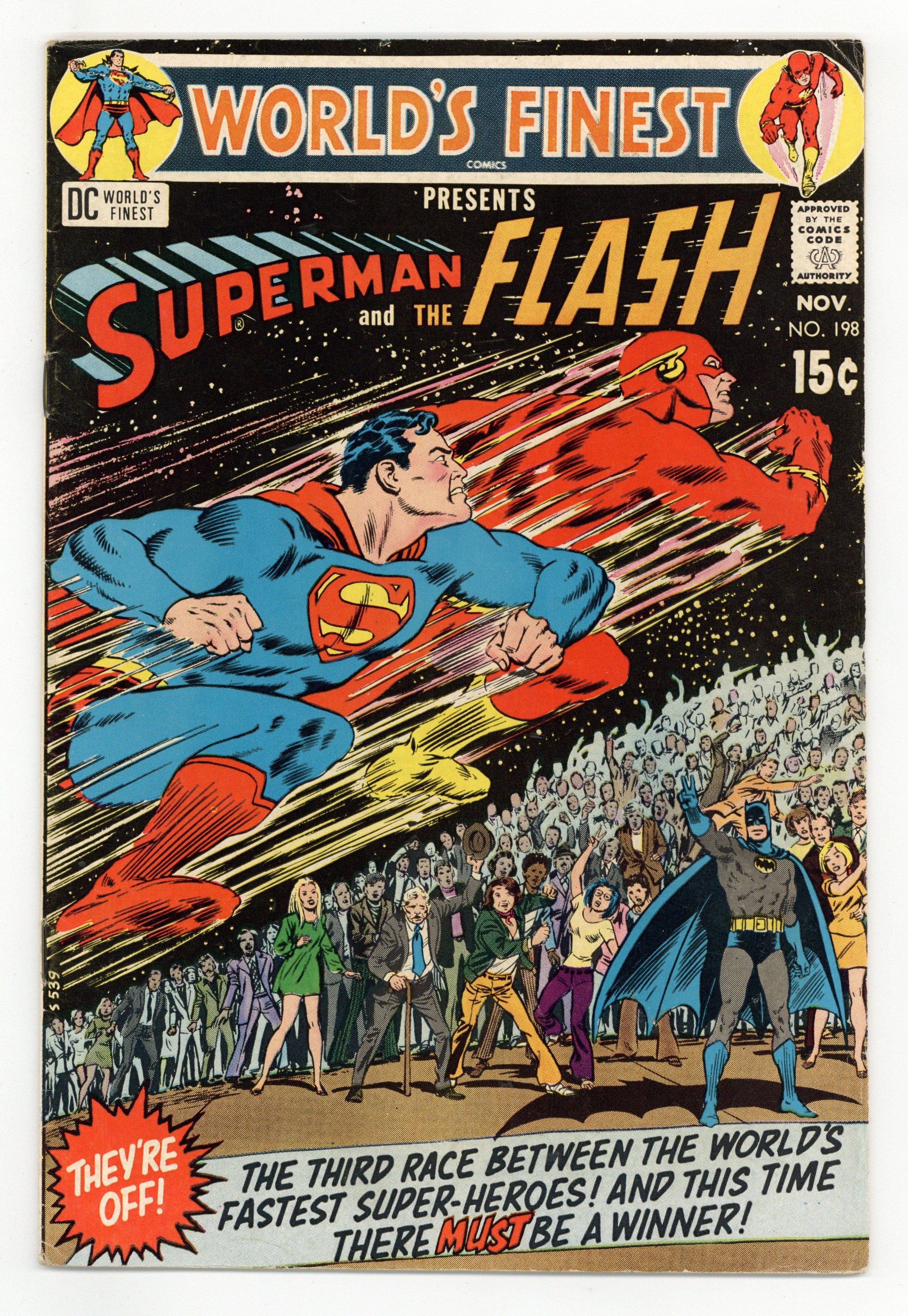 3rd Superman/Flash race. Cover pencils by Curt Swan, inks by Murphy Anderson. Race to Save the Universe! starring Superman and Flash, script by Dennis O'Neil, pencils by Dick Dillin, inks by Joe Giella; Superman and Flash run at twice the speed of light. Joanie Swift, Queen of Speed!--Editors' Round Table: Johnny Quick, art by Paul Norris. 36 Pages, Full Color. Cover price $0.15.