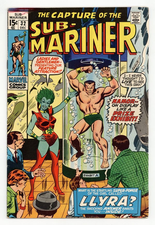 Cover art by Sal Buscema. "Call Her Llyra, Call Her Legend," script by Roy Thomas, pencils by Sal Buscema, inks by Jim Mooney; Seeking an undersea ally, Namor makes his way to the undersea realm of Lemuria; Namor meets Llyra, the empress of Lemuria, who has overthrown Karthon; She tells him of her origin in hopes of persuading him to join her conquest of the sea; Namor wants nothing to do with it and is caught off guard and captured; Namor meets Llyra's sister, Laurie, who frees him; Namor battles with the sea creatures Llyra can control and their battle ends in her death; However, Llyra changes back to Laurie and he realized that they both shared one body; Namor meets her mother and learns that it was her that had actually freed him. 36 pgs., full color. $0.15. Cover price $0.15.