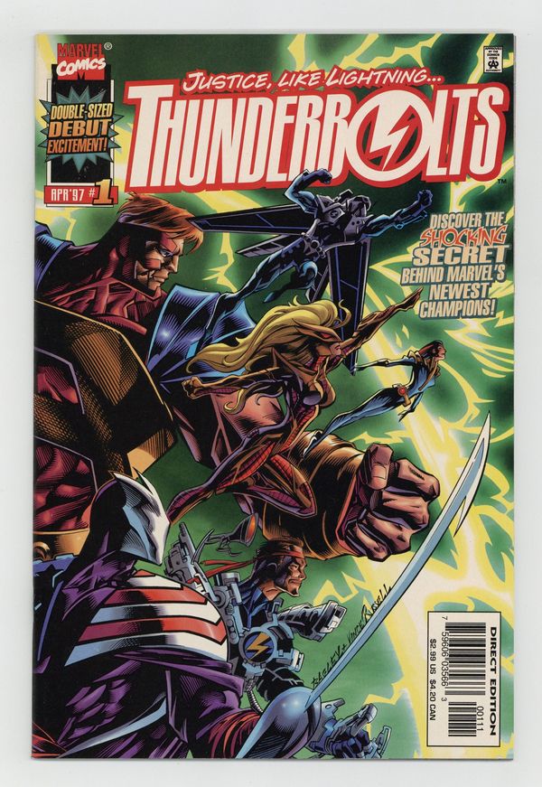 First Printing. Direct Edition. 1st appearance Hallie Takahama (becomes Jolt). Pencils by Mark Bagley, inks by Vince Russell. Justice ... Like Lightning!, script by Kurt Busiek, pencils by Mark Bagley, inks by Vince Russell; Earth's newest heroic team, the Thunderbolts, bursts on the scene to widespread acclaim ... but all is not as it seems. 52 pgs.