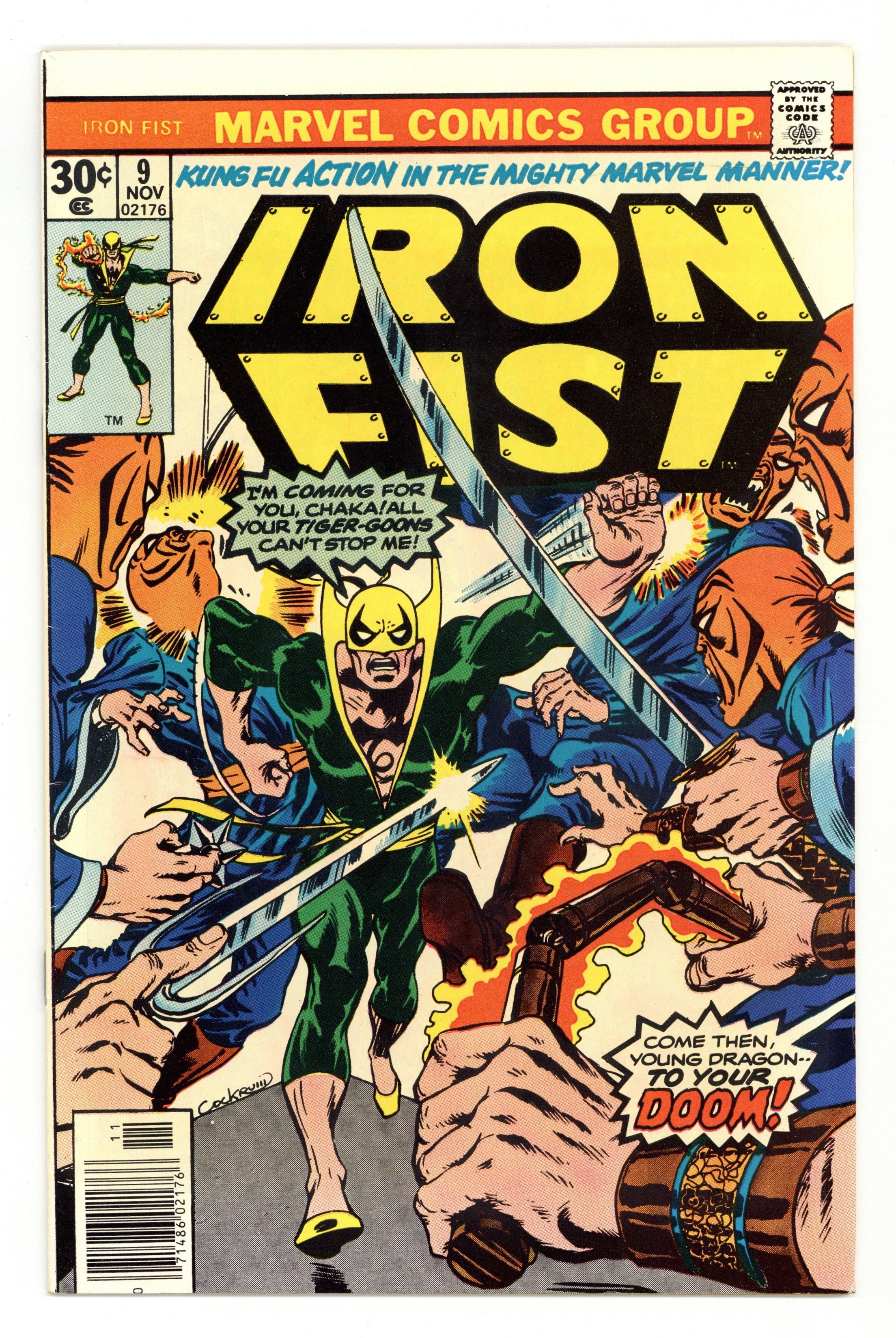 "The Dragon Dies at Dawn!" Part 1 of 2. Story by Chris Claremont. Art by John Byrne and Frank Chiarmonte. Iron Fist must fight his way through a gang of Tiger-Goons, and then he must face Chaka, Crimelord of New York. It's kung fu action in the Mighty Marvel manner! Cover price $0.30.