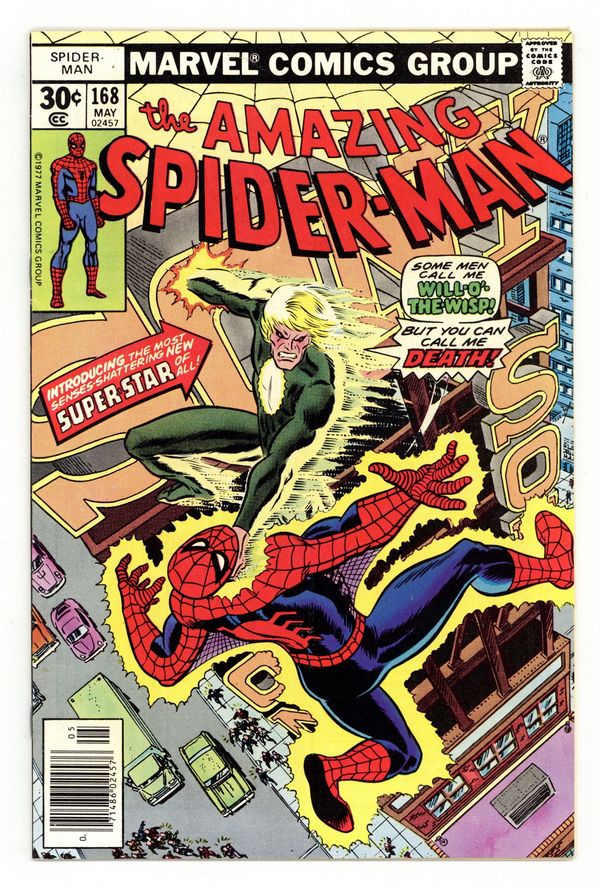 "Murder on the Wind!" Part 2 of 2. Script by Len Wein. Art by Ross Andru (breakdowns) and Mike Esposito (finishes). Cover by Ed Hannigan and John Romita. At the famous Rockefeller Center skating rink; the web-slinger, Will-O'-the-Wisp, and spider-slayer assemble for a tripartite throw down! Once the Wisp flees the scene, Spidey puts Jonah's spider-slayer on ice! Later that evening in Times Square under coercion from Dr. Jonah Harrow, Will-O'-the-Wisp attacks Spider-Man! If the Wisp doesn't kill the web-slinger, he will lose his life! If he does kill him, the Wisp will lose his humanity! Caught in a diabolical dilemma, what will the Wisp do with the wall-crawler's life hanging in the balance? A gut-wrenching conclusion! Cameo appearances by Dr. Marla Madison and Mary Jane Watson. (Notes: Dr. Jonas Harrow previously appeared in Amazing Spider-Man 126 and challenges the web-slinger again in Amazing Spider-Man 206. Will-O'-the-Wisp returns in Spectacular Spider-Man 57.) 36 pages. Cover price $0.30.