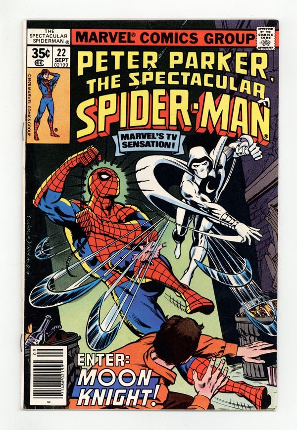 $24.50"By the Light of the Silvery Moon Knight!" Part 1 of 2. Guest-starring Moon Knight. Script by Bill Mantlo. Pencils by Mike Zeck. Inks by Bruce Patterson. Cover by Dave Cockrum and Joe Rubinstein. Moon Knight is waging a one-man war against the Maggia! During a hold-up at a local diner, he receives some unwanted help from the Amazing Spider-Man. Are the two heroes going to fight the Maggia or each other? The Maggia doesn't care, because they've imported a super-villain to beat both of them! Cameo appearances by the White Tiger and the Cyclone. (Note: This issue features the first meeting between Moon Knight and Spider-Man.) 32 pages Cover price $0.35.
