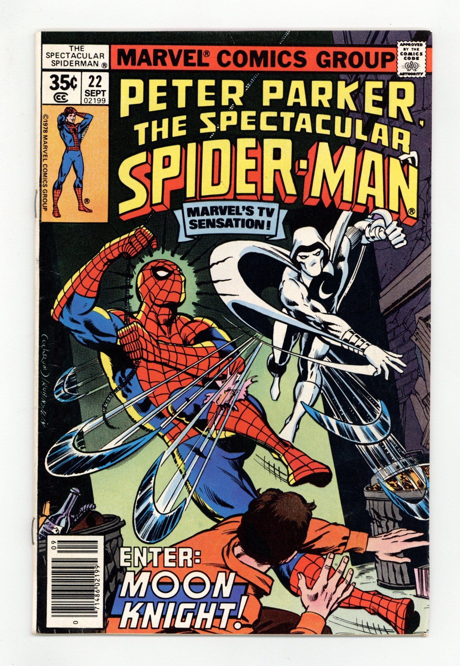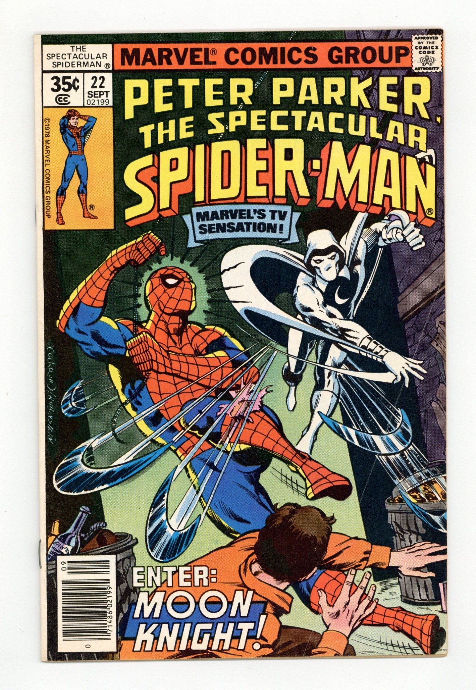 $27.00"By the Light of the Silvery Moon Knight!" Part 1 of 2. Guest-starring Moon Knight. Script by Bill Mantlo. Pencils by Mike Zeck. Inks by Bruce Patterson. Cover by Dave Cockrum and Joe Rubinstein. Moon Knight is waging a one-man war against the Maggia! During a hold-up at a local diner, he receives some unwanted help from the Amazing Spider-Man. Are the two heroes going to fight the Maggia or each other? The Maggia doesn't care, because they've imported a super-villain to beat both of them! Cameo appearances by the White Tiger and the Cyclone. (Note: This issue features the first meeting between Moon Knight and Spider-Man.) 32 pages Cover price $0.35.