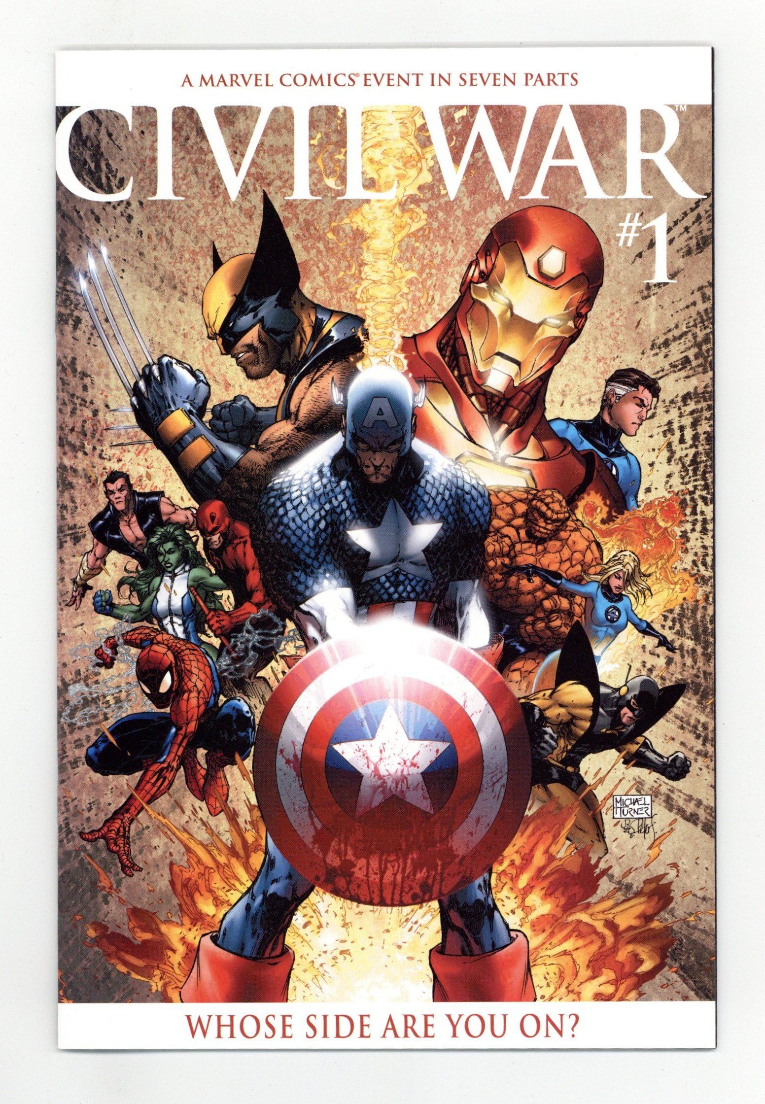 Tags: Civil War (Marvel) (part 1)$38.00Limited Edition Variant Cover. THE LANDSCAPE OF THE MARVEL U IS CHANGING AND IT'S TIME TO DECIDE: WHOSE SIDE ARE YOU ON? A conflict has been brewing in the Marvel Universe for over a year, threatening to pit friend against friend, brother against brother--and all it will take is a single misstep to cost thousands their lives and ignite the fuse! As the war claims its first victims, no one is safe as teams, friendships, and families begin to fall apart. Civil War, a Marvel Comics event in seven parts, stars Spider-Man, the New Avengers, the Fantastic Four, the X-Men and the entirety of the Marvel pantheon! Civil War - the cross-over that rewrites the rules - begins here in this double-sized first issue! Mark Miller story. Steve McNiven & Peter Steigerwald cover. "Death" of the New Warriors, Speedfreak, Coldheart & Cobalt Man. Cover price $2.99.