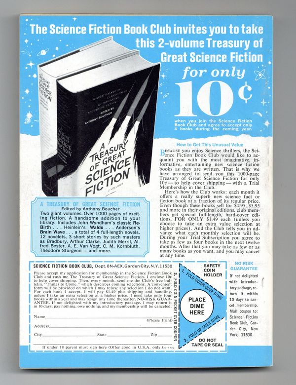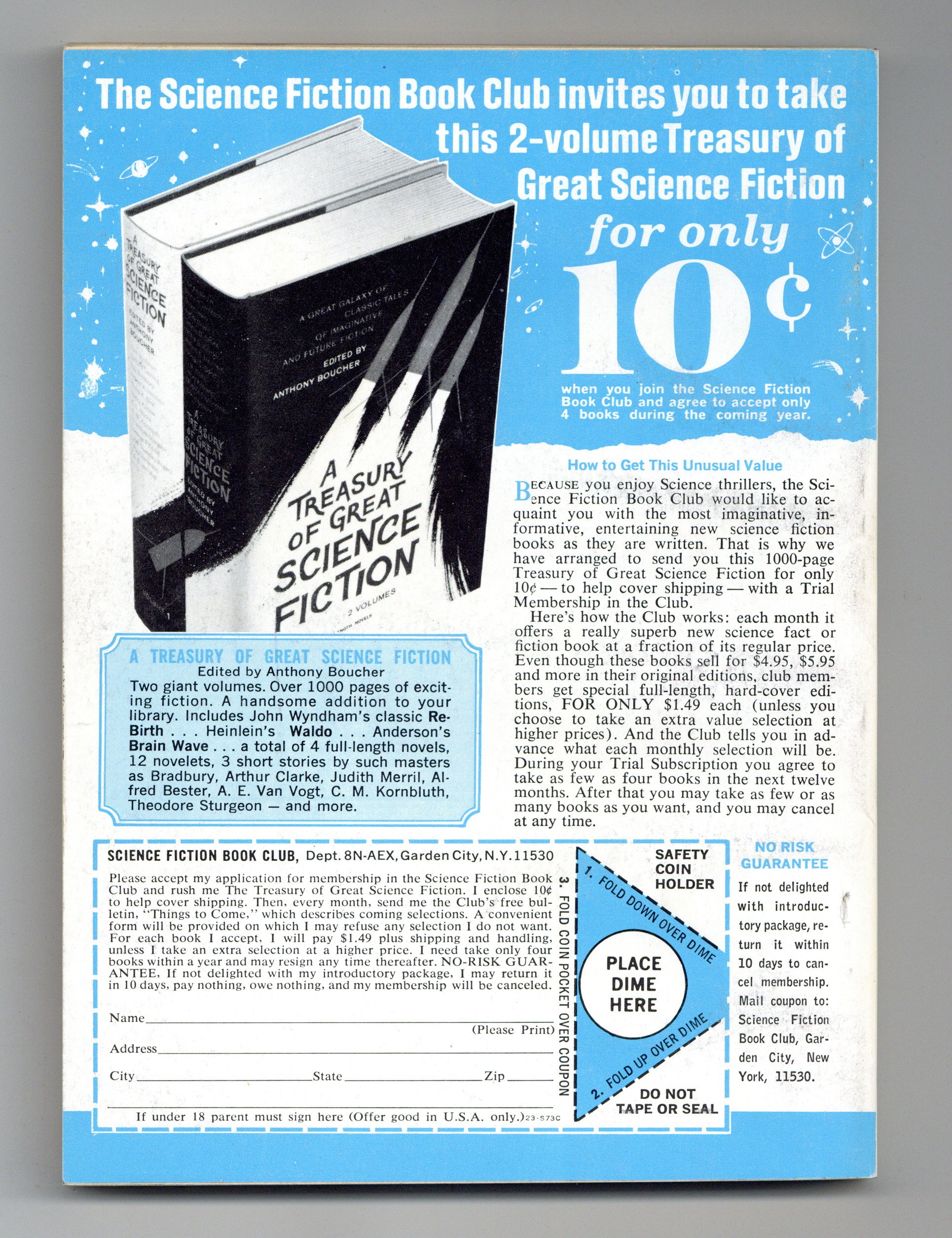 November 1968. Cover by Kelly Freas. Stories: "The Infinity Sense" by Verge Foray, "The Rites of Man" by John T. Phillifent, "Split Personality" by Jack Wodhams, "The Ultimate Danger" by W. McFarlane, and "The Alien Enemy" by Michael Karageorge. Science Fact feature: "The Shots Felt 'Round the World" by Edward C. Walterscheid. Cover by Kelly Freas. Short (though scathing) review of Stanley Kubrick's "2001: A Space Odyssey." Illustrations by Rudi Palais, Kelly Freas and Leo Summers. Softcover, 5.5-in. x 7.5-in.; 178 newsprint pages, B&W. Cover price $0.60.