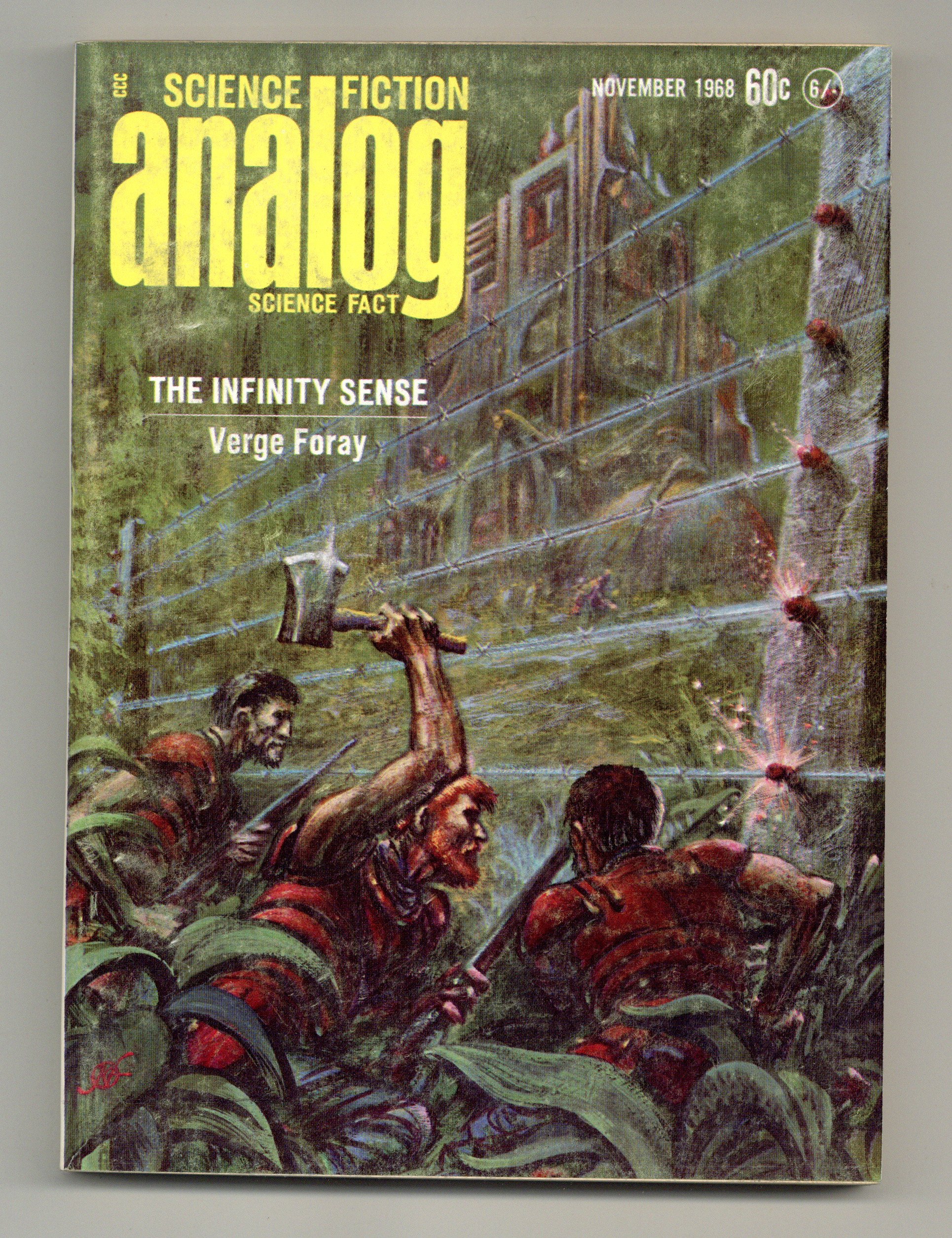 Published Nov 1968 by Dell Magazines.$10.50November 1968. Cover by Kelly Freas. Stories: "The Infinity Sense" by Verge Foray, "The Rites of Man" by John T. Phillifent, "Split Personality" by Jack Wodhams, "The Ultimate Danger" by W. McFarlane, and "The Alien Enemy" by Michael Karageorge. Science Fact feature: "The Shots Felt 'Round the World" by Edward C. Walterscheid. Cover by Kelly Freas. Short (though scathing) review of Stanley Kubrick's "2001: A Space Odyssey." Illustrations by Rudi Palais, Kelly Freas and Leo Summers. Softcover, 5.5-in. x 7.5-in.; 178 newsprint pages, B&W. Cover price $0.60.
