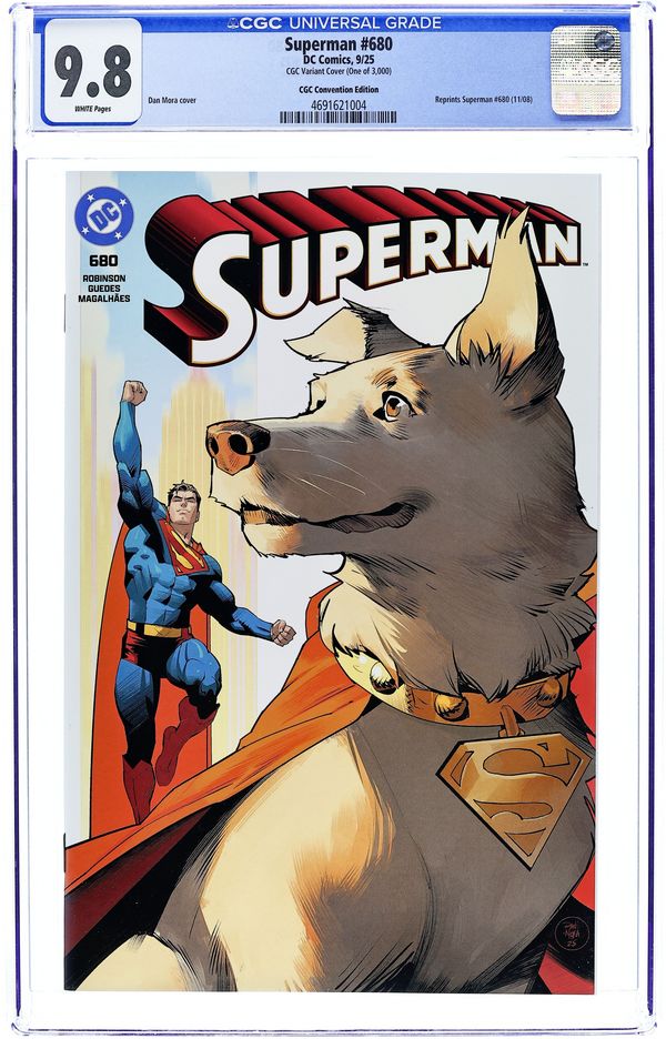 CGC Convention Exclusive Variant Cover by Dan Mora. Reprints material from Superman (1987 2nd Series) #680. Written by James Robinson. Art by Renato Guedes & José Wilson Magalháes. Cover by Alex Ross. "Atlas, Part 4!" - The grand finale of the Atlas epic finds Superman's foe seemingly victorious! With Superman down for the count, who can stand in the way of the city's supposed new ruler? Enter Krypto, (Super)man's best friend, who will do anything to protect his master. Don't miss Krypto at his most heroic, a worthy addition to the Superman Family - and a very good boy. Plus: A new, magical character settles in Metropolis, just when Superman needs him most.