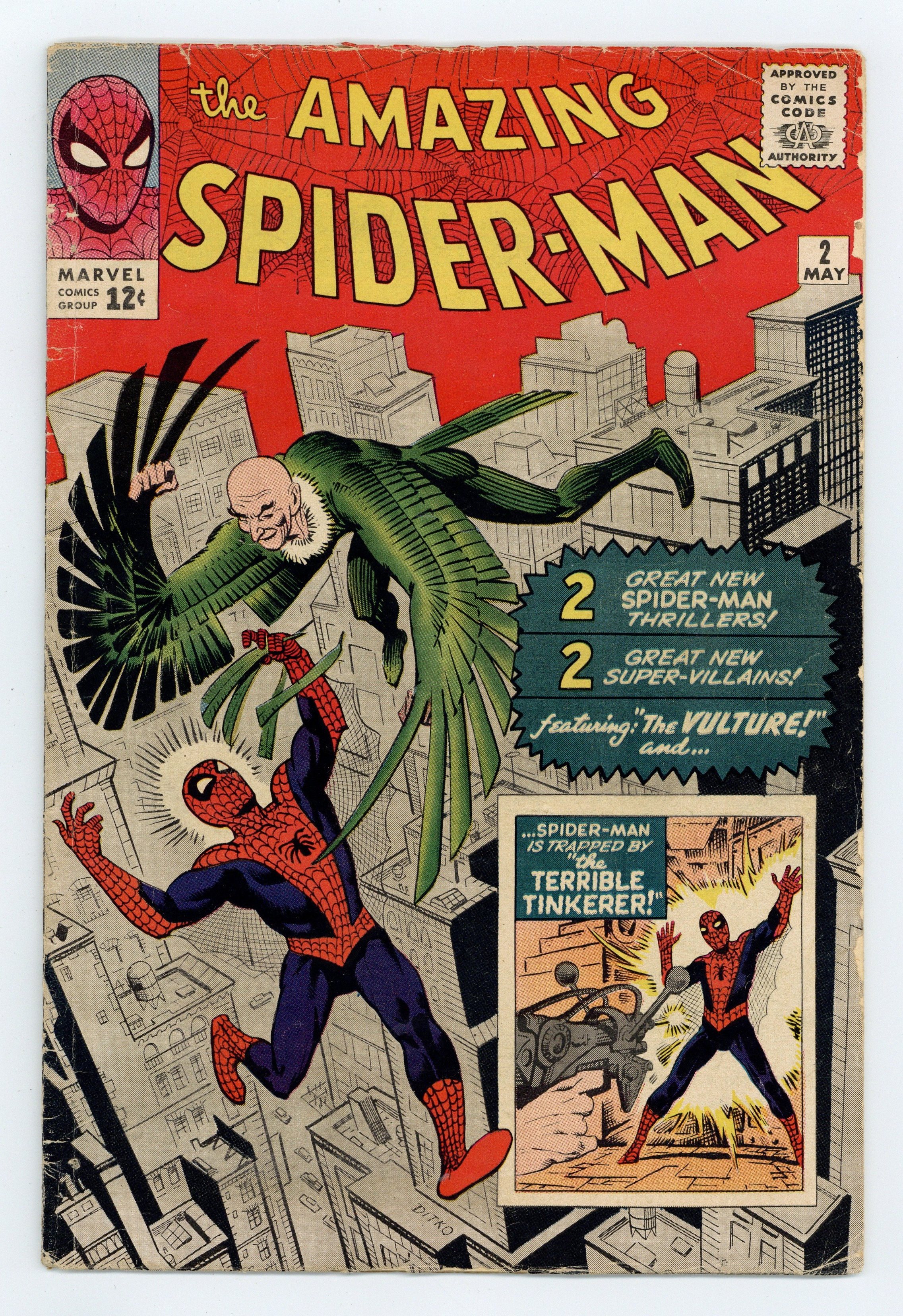 Starts Apr 4 Cover art by Steve Ditko. First appearance of the Vulture in Duel to the Death with the Vulture!, script by Stan Lee, art by Steve Ditko; The Vulture is so confident in his abilities that he announces his plans to steal a diamond shipment to the police; When Spider-Man hears this he decides to stop the Vulture. The Uncanny Threat of the Terrible Tinkerer!, script by Stan Lee, art by Steve Ditko; When Peter Parker discovers some alien modifications to a professor's radio he tracks down a group of aliens with plans to take over the Earth. Reprinted in Marvel Tales # 139. 36 pgs. $0.12. Cover price $0.12.