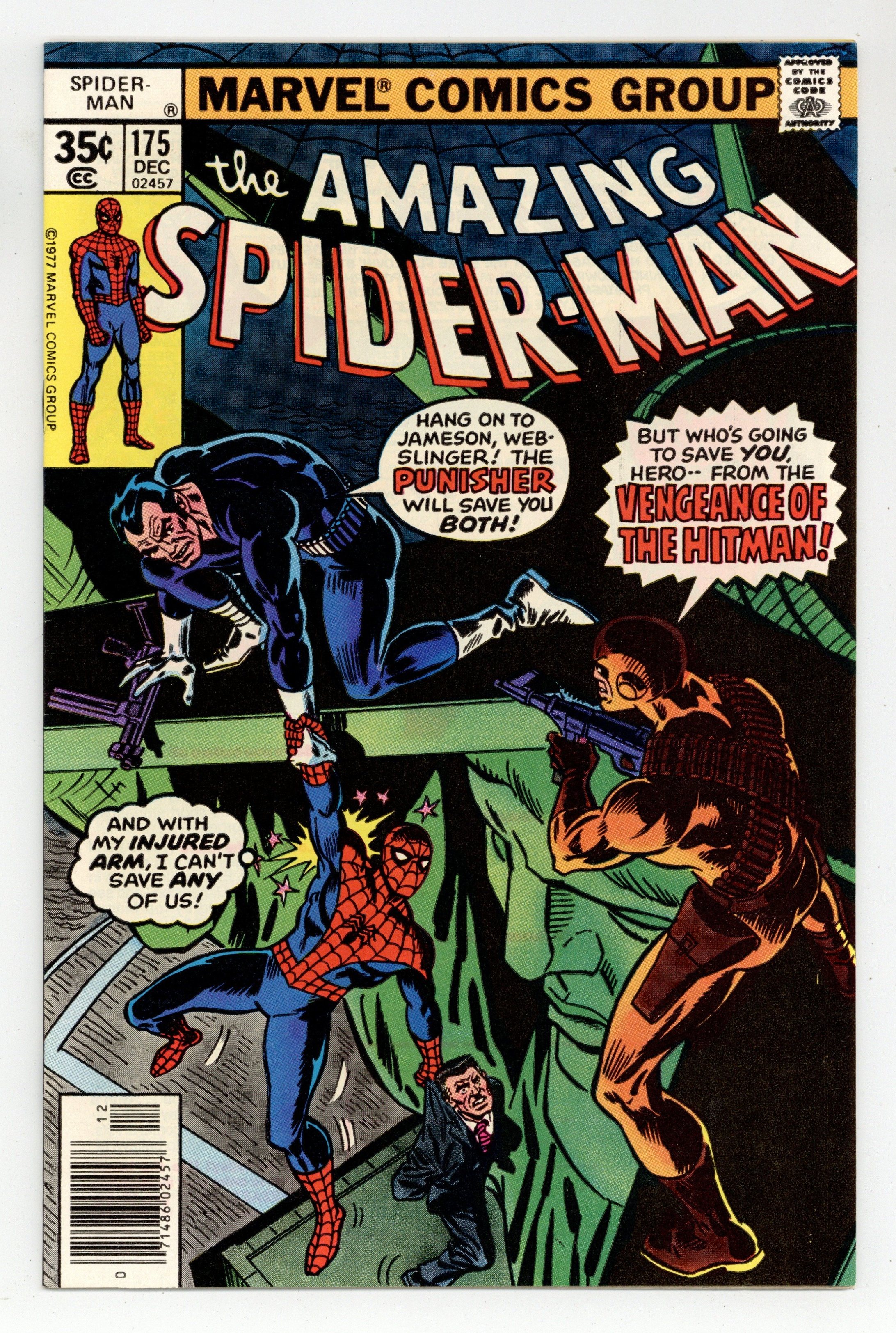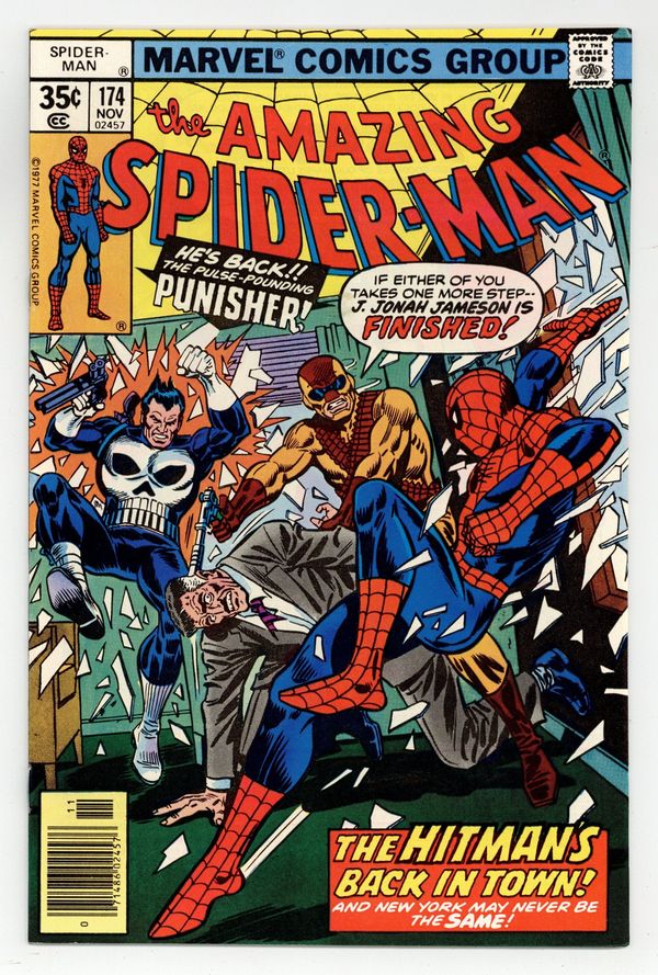 Starts Apr 27 "The Hitman's Back in Town!" Part 1 of 2. Guest-starring the Punisher. Script by Len Wein. Art by Ross Andru (breakdowns), Jim Mooney (finishes), and Tony DeZuniga (finishes). Cover by Ross Andru and Frank Giacoia. The Hitman is back! And he's got a brand new target: J. Jonah Jameson! But there's another gun-toting vigilante back in town too: the Punisher! And he's tracking the Hitman! Mix in the wondrous wall-crawler...and as shown on the dynamic cover, all concerned parties come together in JJJ's corner office! Pandemonium erupts when the bullets start flying! Stay down Jonah! Let Spidey and the Punisher take the hit (man)! Cameo appearances by Harry Osborn, Flash Thompson, Dr. Marla Madison, and Dr. Bart Hamilton. First 35ยข issue. (Notes: The Hitman previously appeared in Spectacular Spider-Man 5. This story was reprinted in Marvel Tales 216.) 36 pages Cover price $0.35.