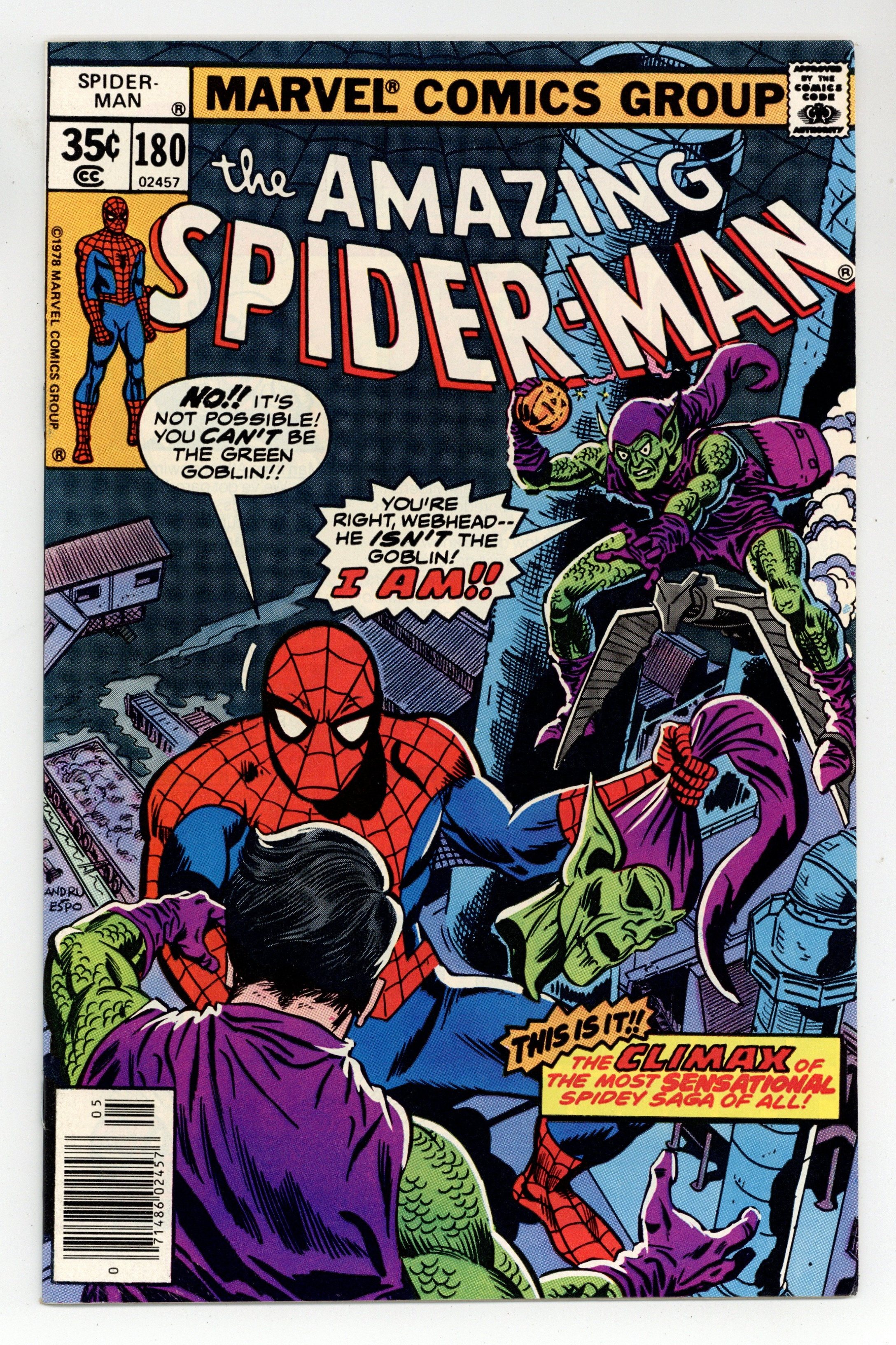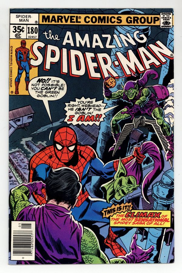 Starts Apr 27 "Who Was That Goblin I Saw You With?" Part 5 of 5. Script by Len Wein. Art by Ross Andru (breakdowns) and Mike Esposito (finishes). Cover by Ross Andru and Mike Esposito. This is it! The awesome conclusion to the five-part goblin saga! At Radio City Music Hall, the Green Goblin emerges triumphant! And the devious purple and green villain flies to an incinerating plant in Brooklyn to throw the unconscious web-slinger into a smokestack! But the spectacular one wakes up just in time! And the final donnybrook between the Green Goblin and the Amazing Spider-Man begins! The wall-crawler is in control of the battle...until a second goblin arrives on the scene! What?! Who? The web-slinger watches in shock as the battle of the goblins unfolds! Can Harry Osborn exorcise the demons of his past? And somehow return to a normal life? An uplifting story! Final appearance of Dr. Bart Hamilton. Cameo appearances by Silvermane, J. Jonah Jameson, Joe Robertson, and Liz Allan. Flashback cameos by Harry Osborn and the Spider-clone. (Notes: More than a decade passes before Harry Osborn becomes the Green Goblin again in Amazing Spider-Man 312. The incinerating plant in this story is the same one where the web-slinger disposed of his clone in Amazing Spider-Man 151. Silvermane returns in Spectacular Spider-Man Annual 2. This issue concludes Len Wein's terrific two-and-a-half year run as the writer of the Amazing Spider-Man title.) 32 pages. Cover price $0.35.