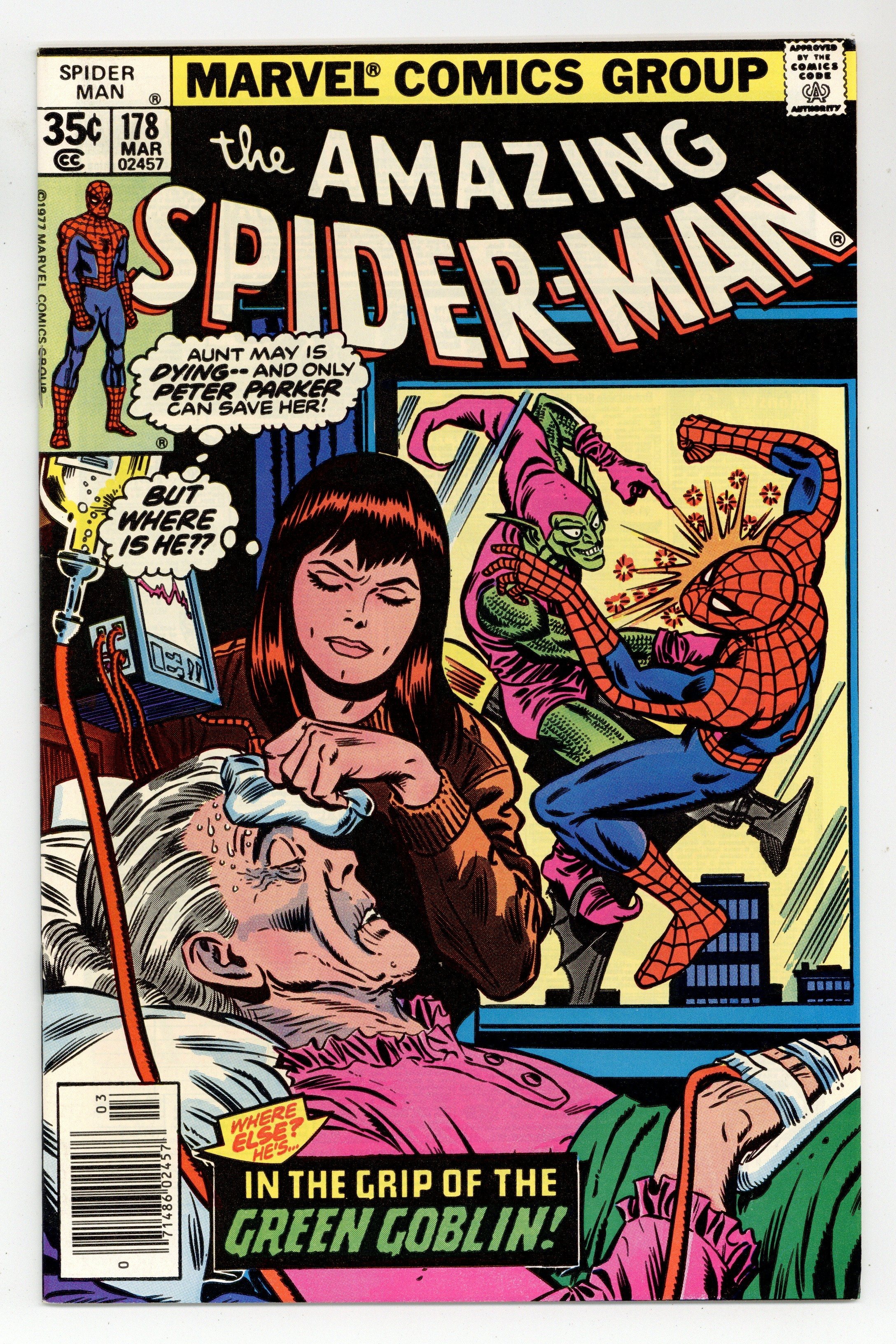 Starts Apr 27 The"Green Grows the Goblin!" Part 3 of 5. Script by Len Wein. Art by Ross Andru (breakdowns) and Jim Mooney (finishes). Cover by Ross Andru and Joe Sinnott. If a picture is worth a thousand words, then the frantic cover says it all! Aunt May lies near death in her hospital bed awaiting life-saving surgery! But the doctors can't operate until her next of kin (aka the wondrous wall-crawler) signs the consent forms! Oh no! Where is the web-slinger? Currently fighting for his own life vs. the Green Goblin! It's a painful predicament in more ways than one for the Spectacular Spider-Man! Cameo appearances by Silvermane, Glory Grant, Joe Robertson, J. Jonah Jameson, Anna Watson, and Harry Osborn. (Note: The letters page includes a statement of ownership: average print run 587,702; average paid circulation 281,860.) 36 pages. Cover price $0.35.