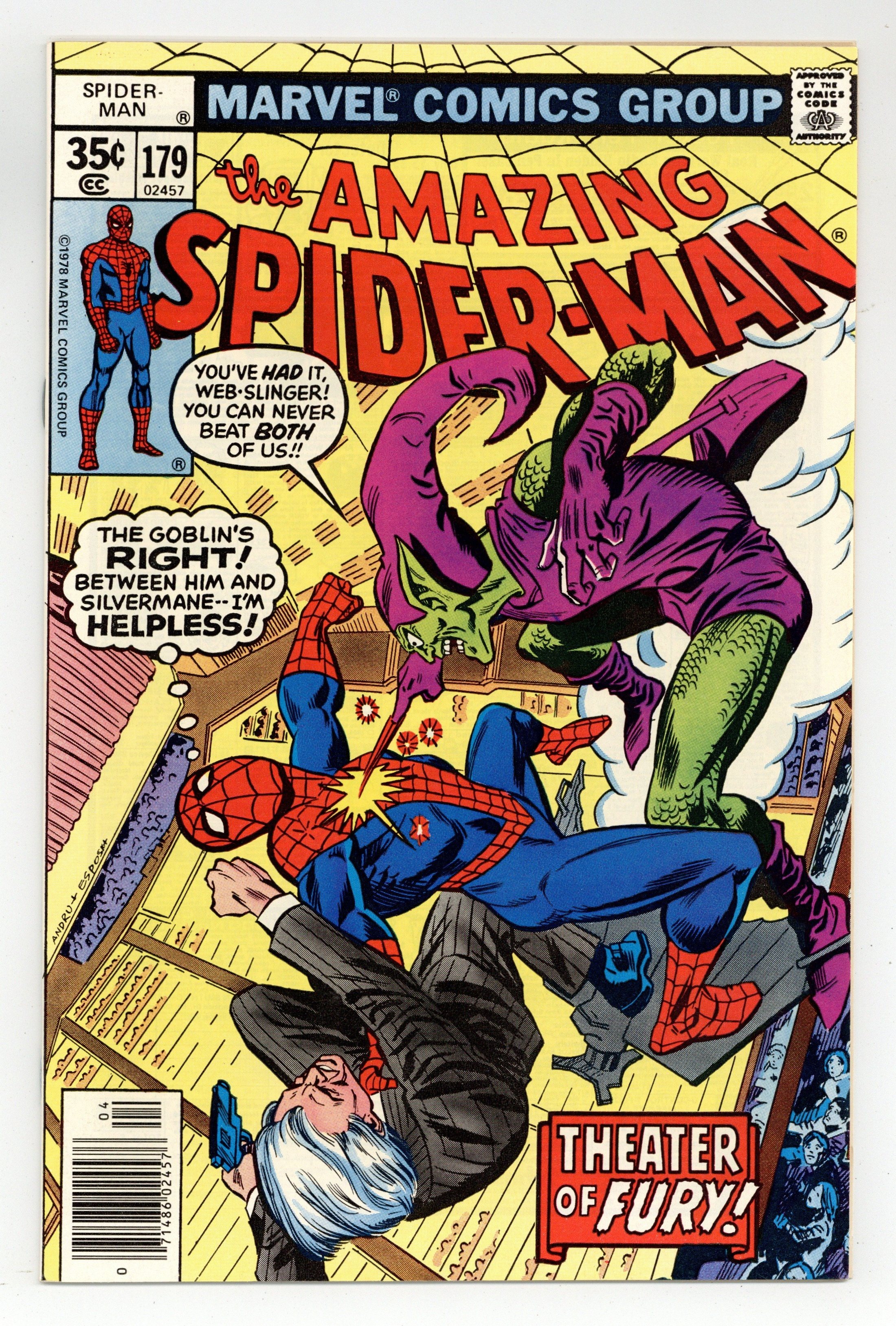 Starts Apr 27 "The Goblin's Always Greener!" Part 4 of 5. Script by Len Wein. Art by Ross Andru (breakdowns) and Mike Esposito (finishes). Cover by Ross Andru and Mike Esposito. In desperate fashion the web-slinger escapes from the Green Goblin's trap and makes a beeline for New Hope Hospital! Once inside Peter finally signs the consent forms to begin his aunt's surgery! While May's heart operation takes place, Joe Robertson tells Peter about a major disturbance going on at Radio City Music Hall. When the wall-crawler arrives at the Showplace of the Nation, the three-way battle erupts: the Green Goblin vs. Silvermane vs. the Amazing Spider-Man! And the winner will be determined next issue! Cameo appearances by Mary Jane Watson, Anna Watson, and Harry Osborn. 36 pages. Cover price $0.35.