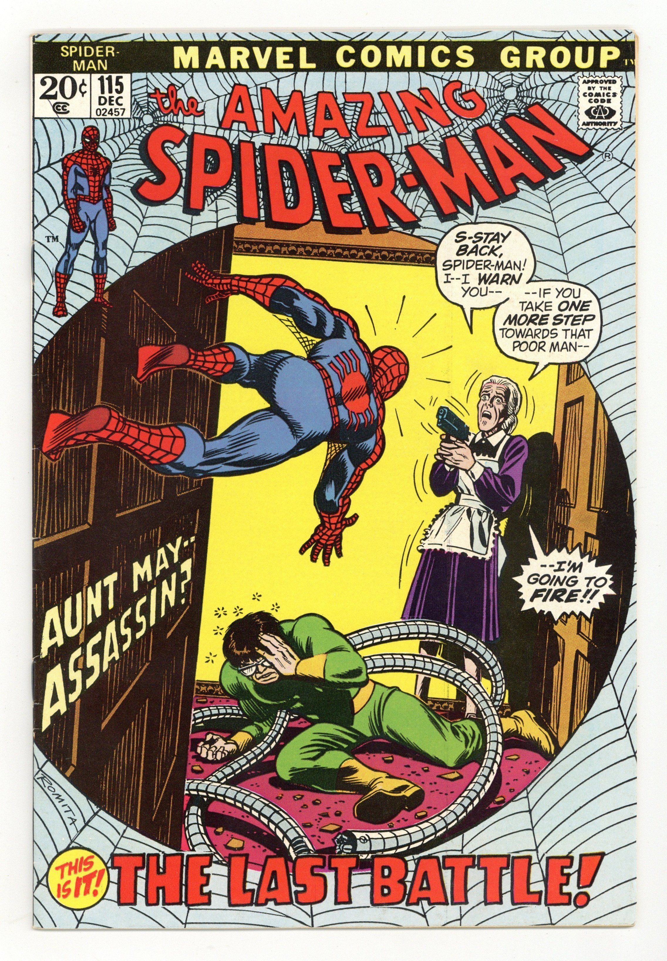 Starts Apr 27 "The Last Battle!" Part 3 of 3. Script by Gerry Conway. Art by John Romita and Tony Mortellaro (backgrounds). Cover by John Romita. It's a wild shootout in Westchester as the gang war between Hammerhead and Dr. Octopus reaches its conclusion! And amidst the raging gun battle, Spider-Man finds Aunt May! But shockingly, Aunt May has thrown in with Doc Ock! So while dodging Doctor Octopus' arms and Hammerhead's bullets, the web-slinger has to make sure -- he doesn't get clipped by his dear aunt! In the meantime, the Daily Bugle learns about the firefight in Westchester; andJoe Robertson, Ned Leeds, and Gwen Stacy drive to the scene! Can your friendly neighborhood Spider-Man defeat two super-villains -- and save his Aunt May -- in one fell swoop? What a finish! Cameo appearances by J. Jonah Jameson and Betty Brant. (Notes: John Romita is credited as aco-plotter. Hammerhead and Dr. Octopus return in Amazing Spider-Man 130. This issue is reprinted in Marvel Tales #94.) 36 pages. Cover price $0.20.