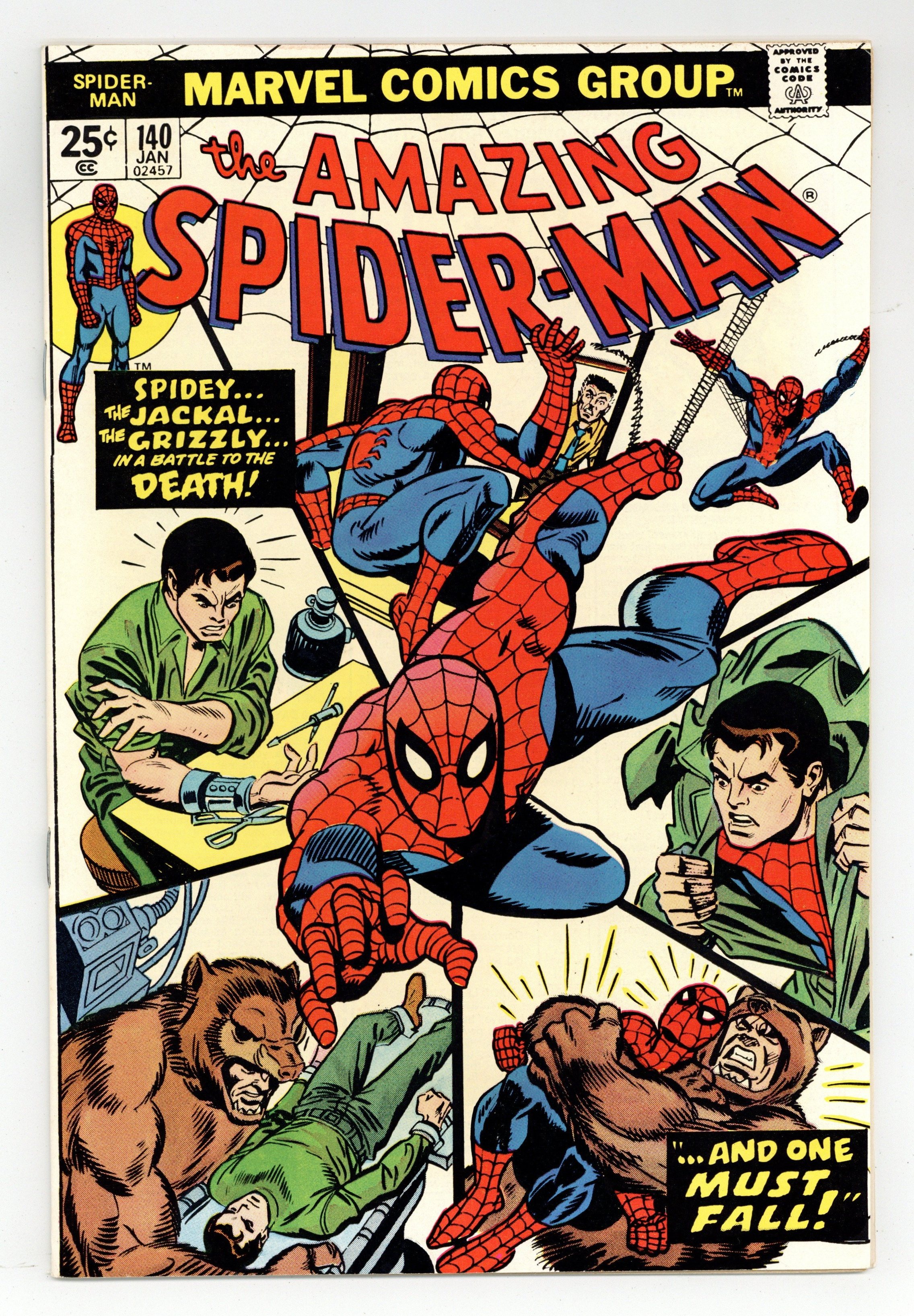 Starts May 4 "...And One Will Fall" Part 2 of 2. Script by Gerry Conway. Pencils by Ross Andru. Inks by Frank Giacoia and Dave Hunt (backgrounds). Cover by Gil Kane and Mike Esposito. The conniving Jackal lures the wall-crawlers alter-ego into an ambush at Washington Square! And then attaches a metal harness to his arm! The spectacular one's spider powers won't get him out of this jam! It's up to his brainpower! Later on though the web-slinger will call upon all of his speed, strength, and agility to declaw the Grizzly! Origin of the Grizzly. Cameo appearances by Betty Brant, Ned Leeds, Flash Thompson, J. Jonah Jameson, and Glory Grant (first appearance). Flashback cameos by Liz Allan and Joe Robertson. (Notes: The Grizzly returns many years later in Web of Spider-Man 58. This issue contains a full-page ad for the second issue of Marvel Treasury Edition (1974) featuring the Fantastic Four. The letters page includes Marvel Value Stamp series A #75 Morbius by Pablo Marcos. This story was reprinted in Marvel Tales 117.) 36 pages. 25c cover price. Cover price $0.25.