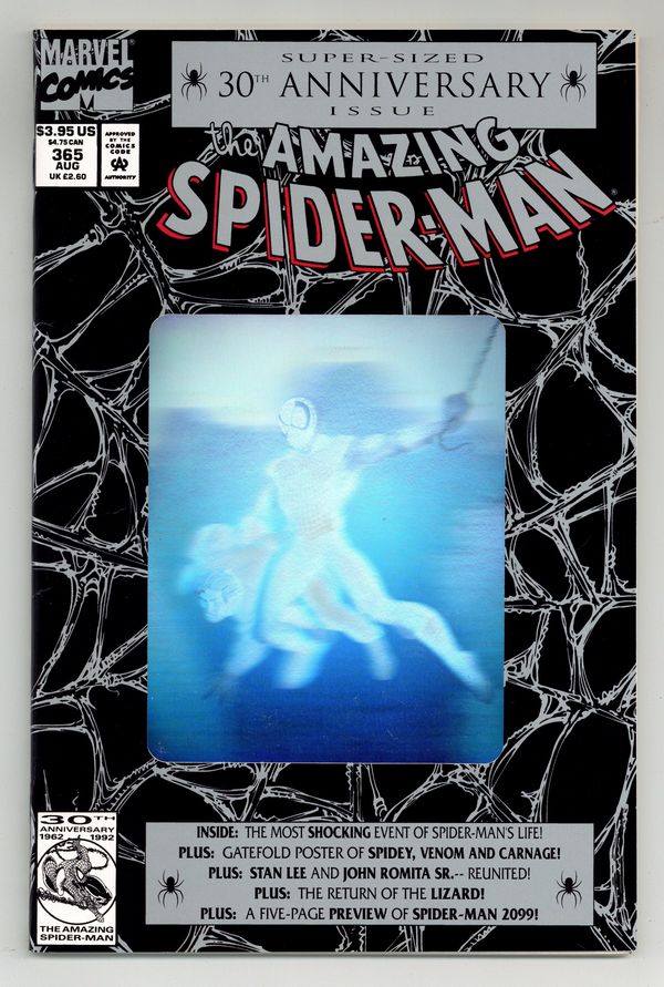 Starts Apr 4 Direct Edition. 80-page giant 30th Anniversary issue, with the first appearance of Spider-Man 2099! The Lizard returns in "Fathers and Sins." Script by David Michelinie, pencils by Mark Bagley, inks by Randy Emberlin. J. Jonah Jameson is featured in "How I Created Spider-Man!" Script by David Michelinie, art by Aaron Lopresti. Gwen Stacy takes center stage in "I Remember Gwen." Script by Stan Lee, plot by Tom DeFalco, art by John Romita Sr. (Cameos by the Green Goblin and Doctor Octopus.) The Prowler is also here in "A Friend in Need." Script by Tom DeFalco, pencils by Tod Smith, inks by Andrew Pepoy. There are also two text pieces, "The Saga of Spidey's Parents" by Stan Lee, and "Spider-Man: The First Thirty Years" by Peter Sanderson. Spider-Man 2099 gets a sneak preview, with a script by Peter David, pencils by Rick Leonardi, and inks by Al Williamson. This issue was originally released with a fold-out poster of Spidey versus Venom and Carnage (poster may be missing in lower grades). 84 pgs. Cover price $3.95.