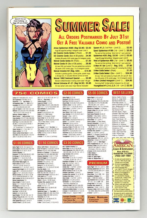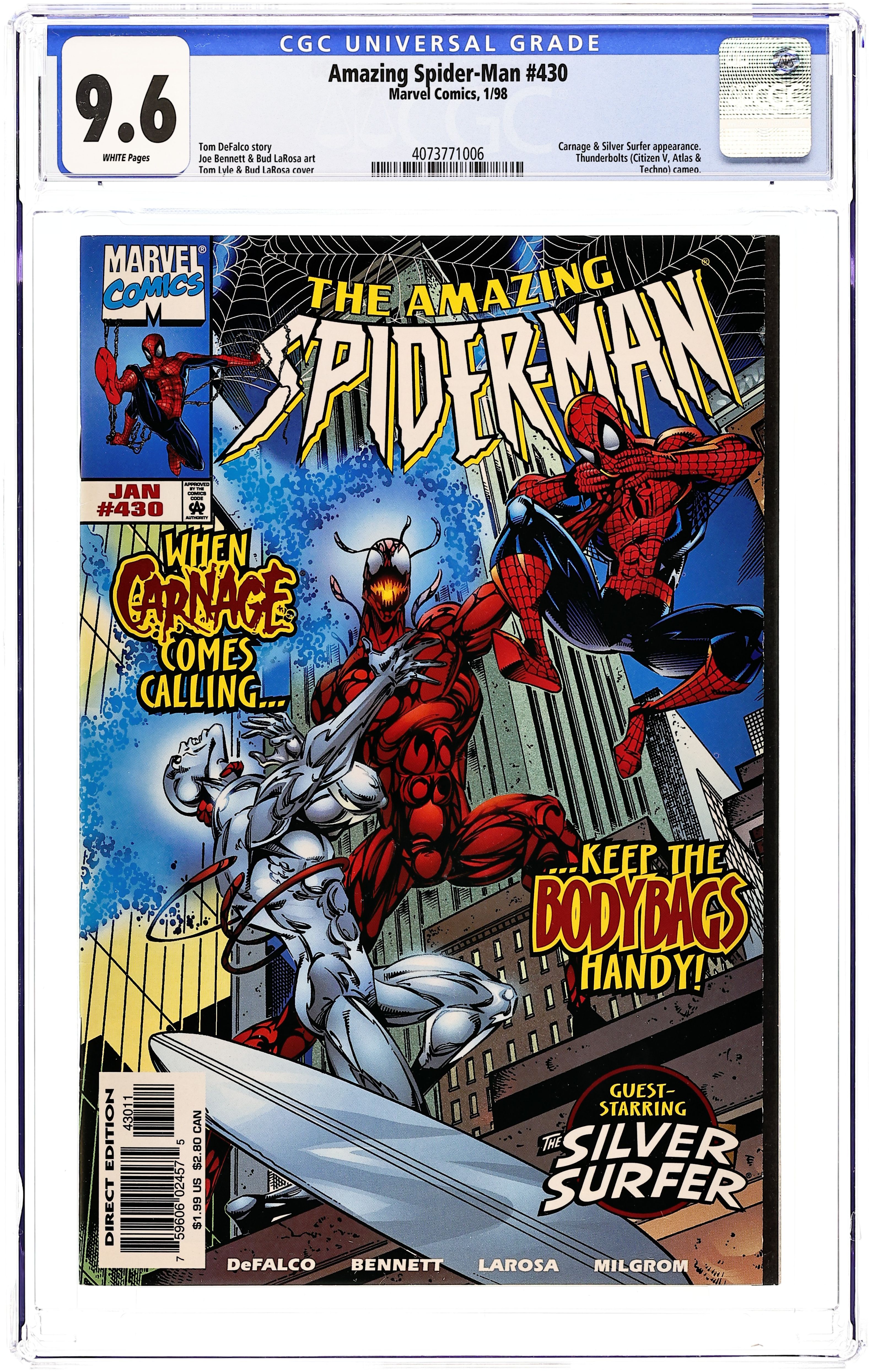 Ends Mar 30 7:16 PM CST Bid History 6 bids Current Bid $23 Your Secret Max Bid If you'd like to bid, please log in or register. Direct Edition. Cover pencils by Tom Lyle, inks by Bud LaRosa. Carnage and the Silver Surfer guest star in "Savage Rebirth!", script by Tom DeFalco, pencils by Joe Bennett, inks by Bud LaRosa; Spider-Man rejoices that the Avengers have been confirmed to be alive; He begins dealing with the one million dollar reward the Bugle has on him; He heads toward the Baxter Building to visit the Fantastic Four, only to remember that the Thunder Bolts recently purchased the building; Peter agrees to quit being Spider-Man, as Mary meets up with Jill; Dr. Ashley Kafka, the new director of the Ravencroft Institute wants to shut down the microwave field holding back Cletus Kasady in order to cut costs. Cameos by Captain America, Iron Man, and the Vision. 38 pgs., full color. $1.99. Cover price $1.99.