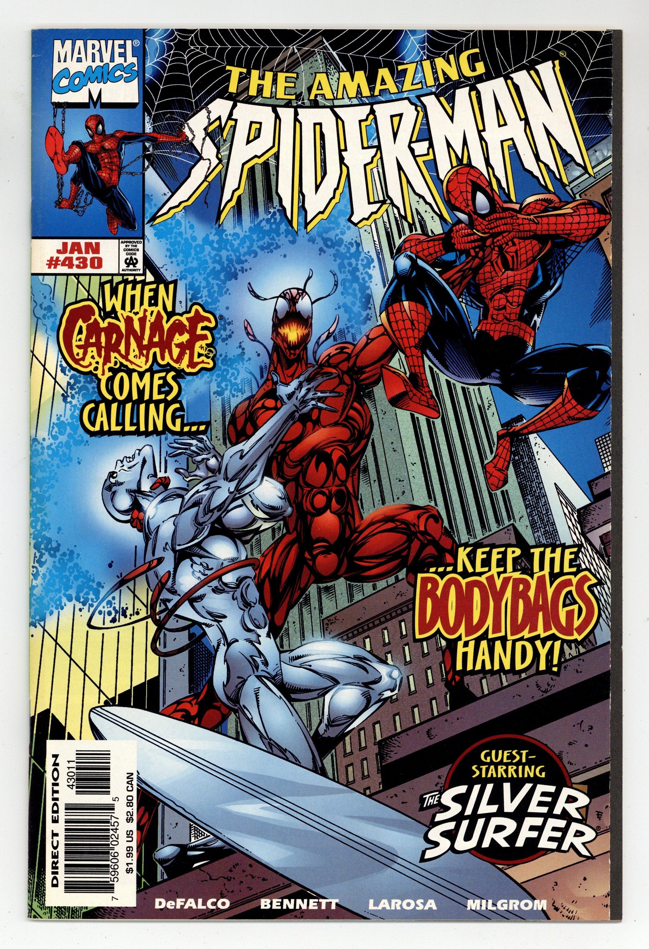 Starts Apr 27 Direct Edition. Cover pencils by Tom Lyle, inks by Bud LaRosa. Carnage and the Silver Surfer guest star in "Savage Rebirth!", script by Tom DeFalco, pencils by Joe Bennett, inks by Bud LaRosa; Spider-Man rejoices that the Avengers have been confirmed to be alive; He begins dealing with the one million dollar reward the Bugle has on him; He heads toward the Baxter Building to visit the Fantastic Four, only to remember that the Thunder Bolts recently purchased the building; Peter agrees to quit being Spider-Man, as Mary meets up with Jill; Dr. Ashley Kafka, the new director of the Ravencroft Institute wants to shut down the microwave field holding back Cletus Kasady in order to cut costs. Cameos by Captain America, Iron Man, and the Vision. 38 pgs., full color. $1.99. Cover price $1.99.