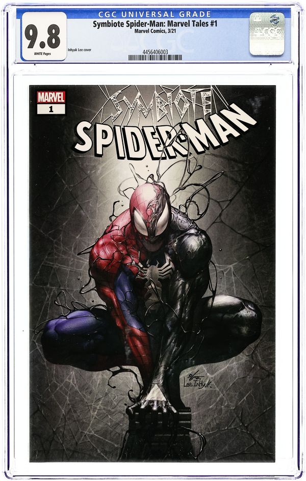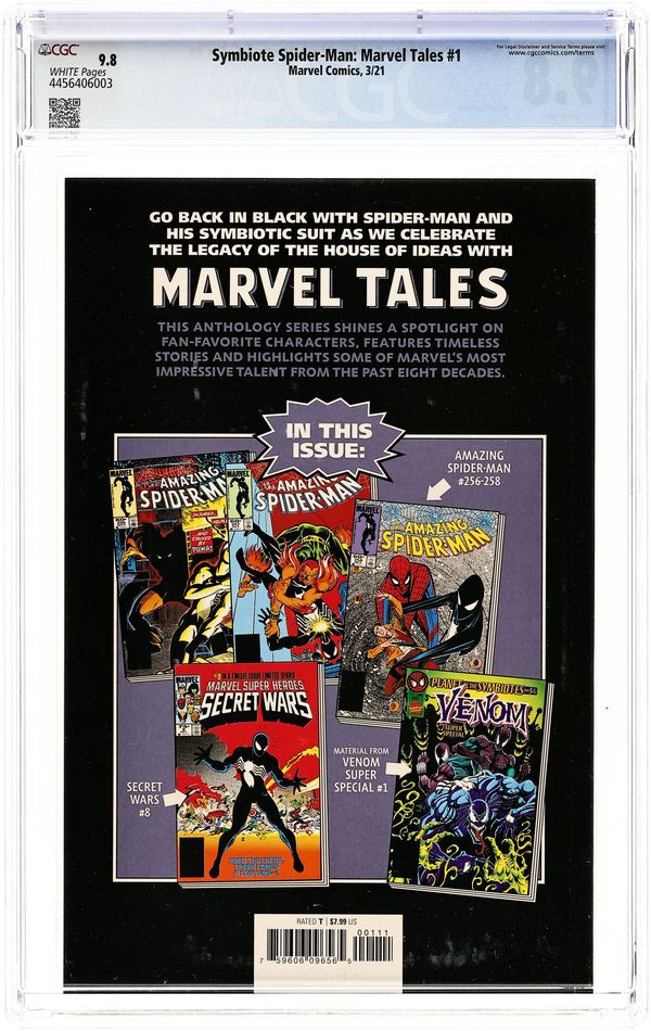 Written by Jim Shooter, Tom DeFalco and Dan Slott. Art by Mike Zeck, Ron Frenz, Mark Bagley, John Beatty, Jack Abel, Mike Esposito, Joe Rubinstein and Arne Starr. Art by Mike Zeck. Cover by Inhyuk Lee. Go back in black with Spider-Man and his symbiotic suit as we celebrate the legacy of the House of Ideas with MARVEL TALES! This anthology series shines a spotlight on fan-favorite characters, features timeless stories and highlights some of Marvel's most impressive talent from the past eight decades. First, amid the chaos of Secret Wars, there comes a costume in MARVEL SUPER HEROES SECRET WARS #8 from the titanic team of Jim Shooter and Mike Zeck! But there's more to the outfit than meets the eye - as Spider-Man, the ferocious Puma and the Fantastic Four all discover in AMAZING SPIDER-MAN (1963) #256-258 by Tom DeFalco and Ron Frenz! Plus: A mighty Marvel team-up of legendary Spidey creators Dan Slott and Mark Bagley results in a poignant tale featuring the late, lamented police captain Jean DeWolff, from VENOM SUPER SPECIAL #1! 112 pages, full color. Rated T Cover price $7.99.