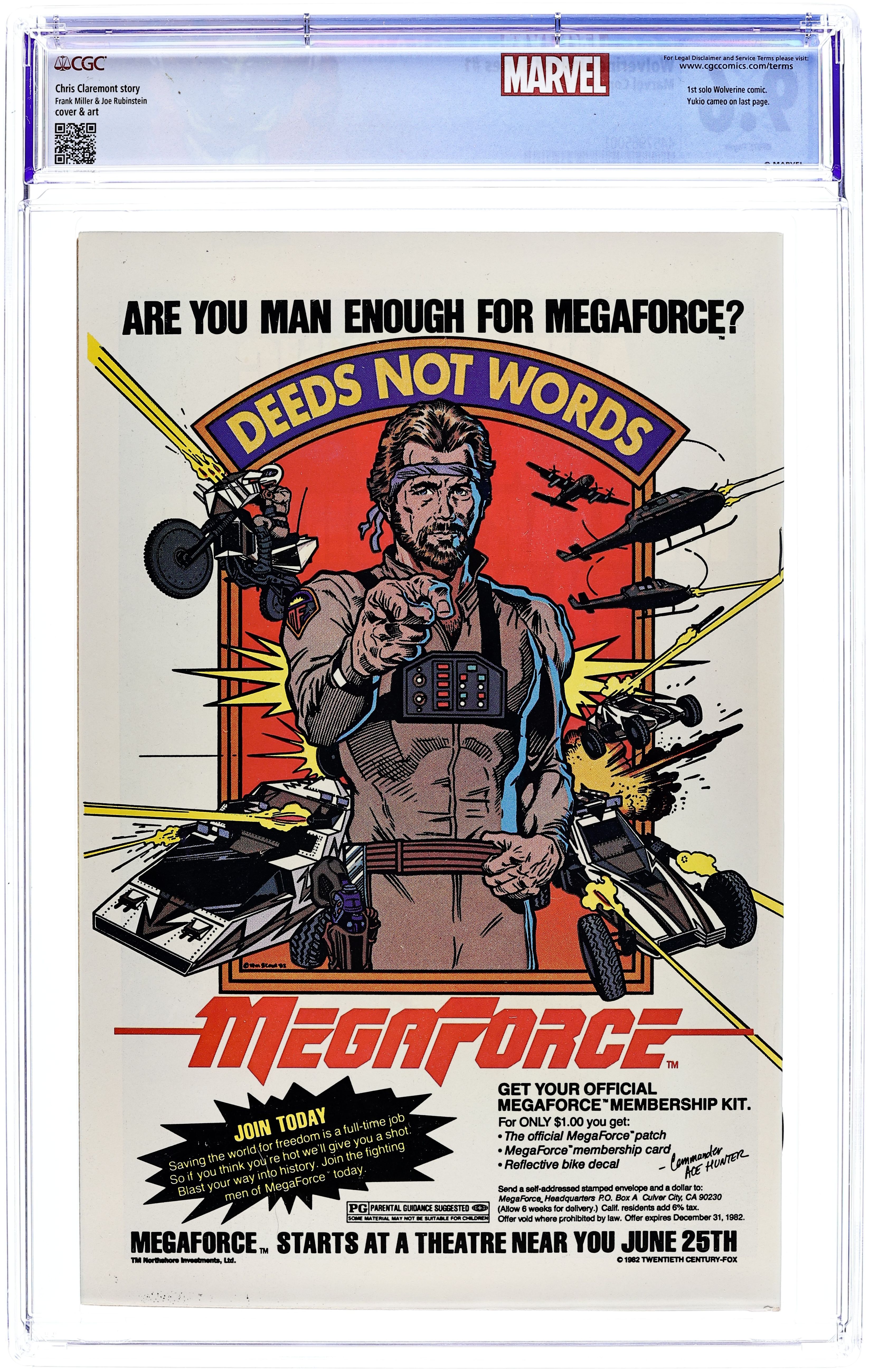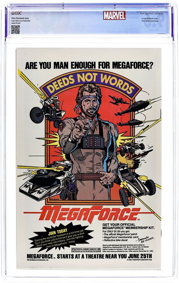 Starts Apr 4 Direct Edition. 1 of 4 Featuring Wolverine in his first solo series fighting in Japan. "Wolverine." Script by Chris Claremont, pencils by Frank Miller, inks by Joe Rubinstein. Miller/Rubinstein cover. Back cover MegaForce ad with art by William Stout. Cover price $0.60.
