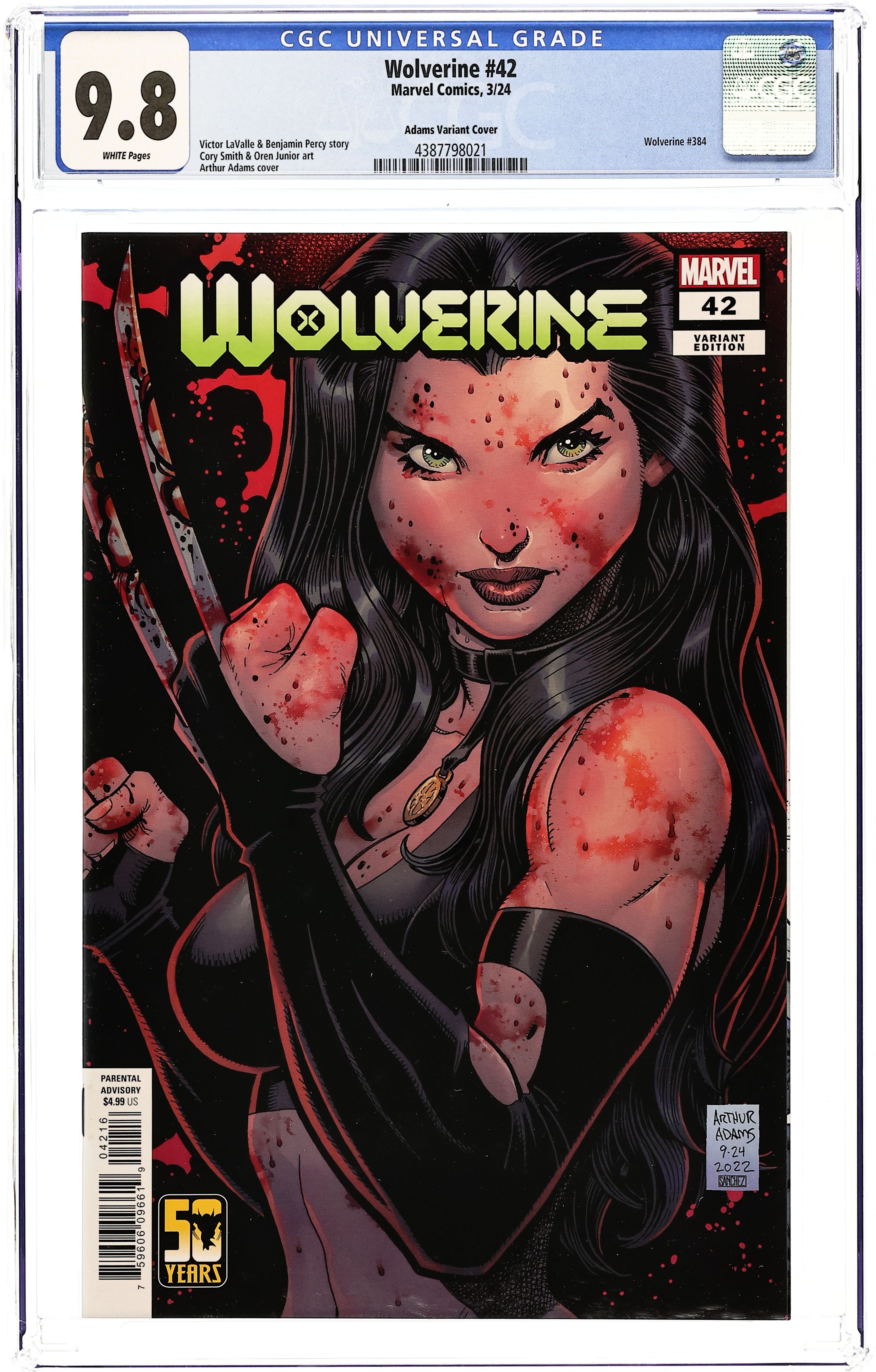 Starts Apr 4 Limited 1 for 25 Retailer Incentive Variant Cover. Written by Benjamin Percy; Victor LaValle. Art by Cory Smith. Cover by Arthur Adams. SABRETOOTH WAR - PART 2! VICTOR CREED and the SABRETEETH have big plans for LOGAN. See the war escalate under the claws of the many Creeds! 32 pages, full color. Rated Parental Advisory Cover price $4.99.