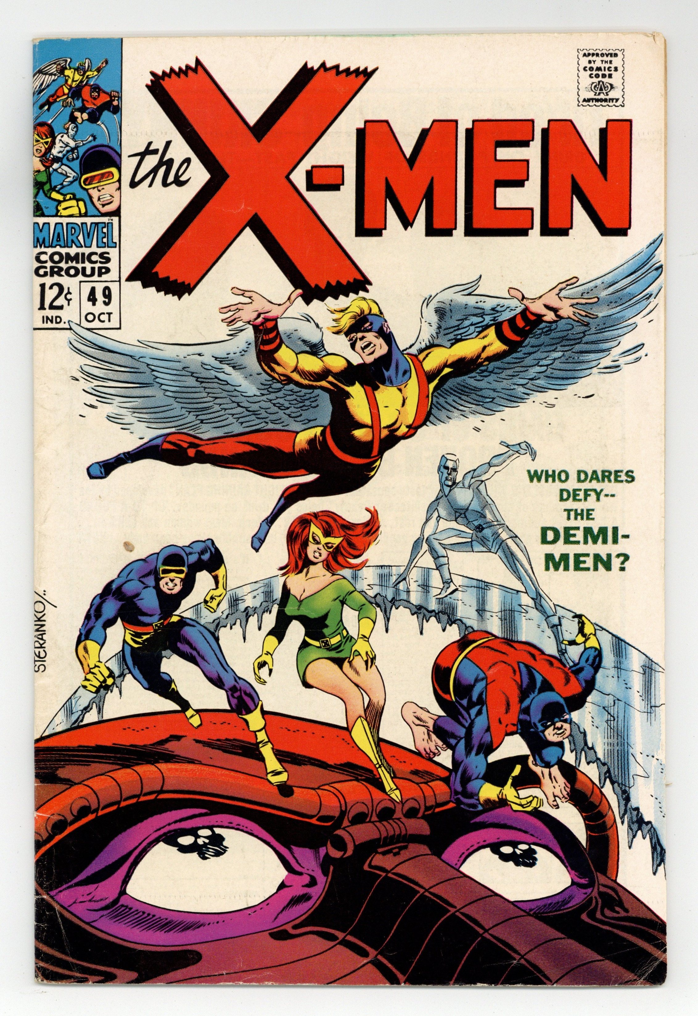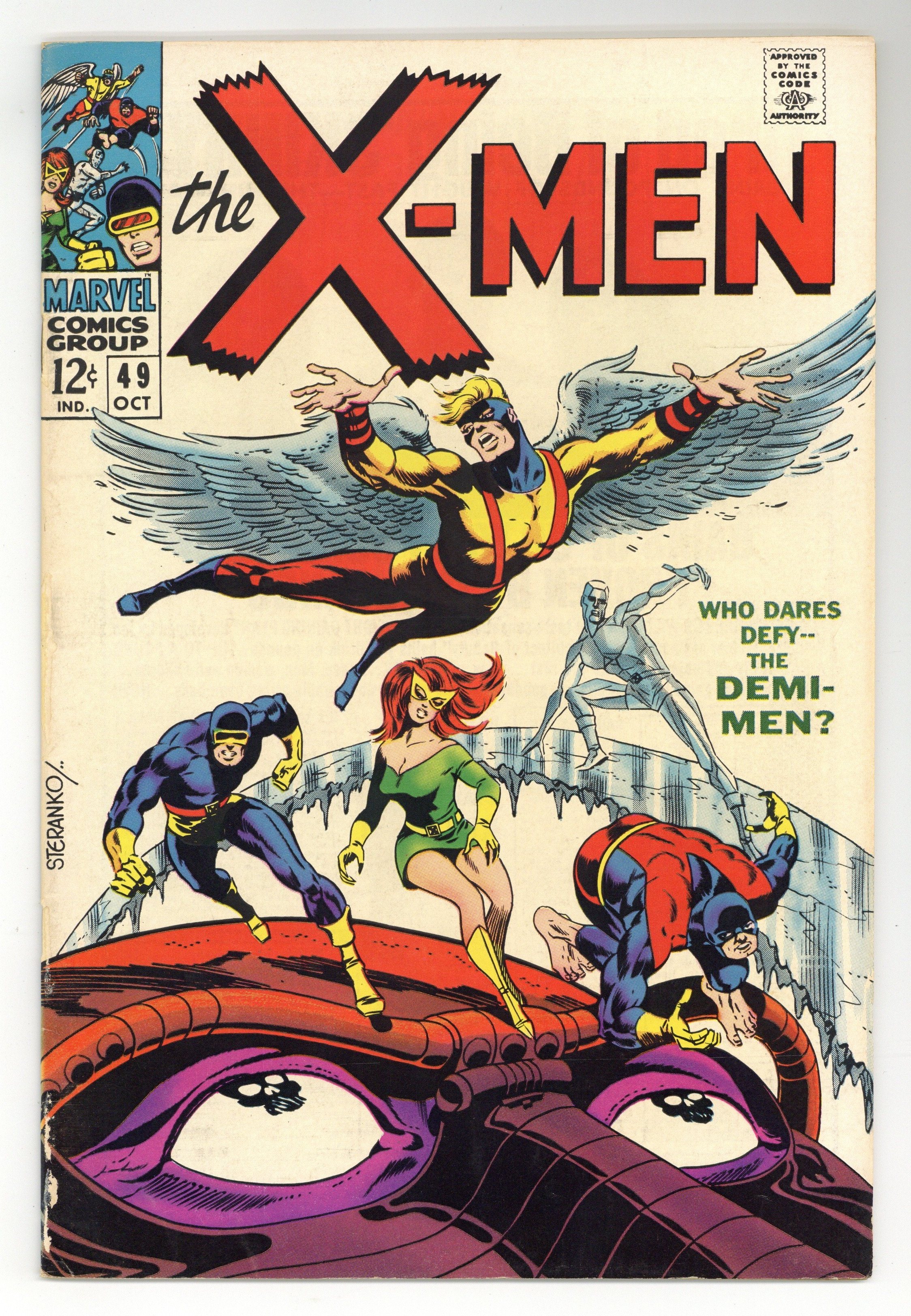 Starts Jan 3 First appearance of Lorna Dane (Polaris). Cover art by Jim Steranko. Who Dares Defy the Demi-Men?, script by Arnold Drake, pencils by Don Heck and Werner Roth, inks by John Tartaglione; Angel warns Jean about Cerebro beeping loudly, and she tells the other X-Men; a group commanded by Mesmero uses a machine (along with his powers) to turn latent mutants into full-fledged mutants in order to form his army; 1st appearance of Mesmero. A Beast Is Born--The Origins of the Uncanny X-Men, script by Arnold Drake, art by Werner Roth; how Beast got his powers. Letter to the editor from comic writer Tony Isabella. 36 pgs. $0.12. Cover price $0.12.