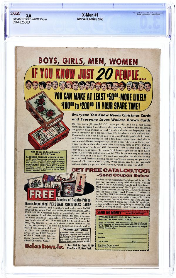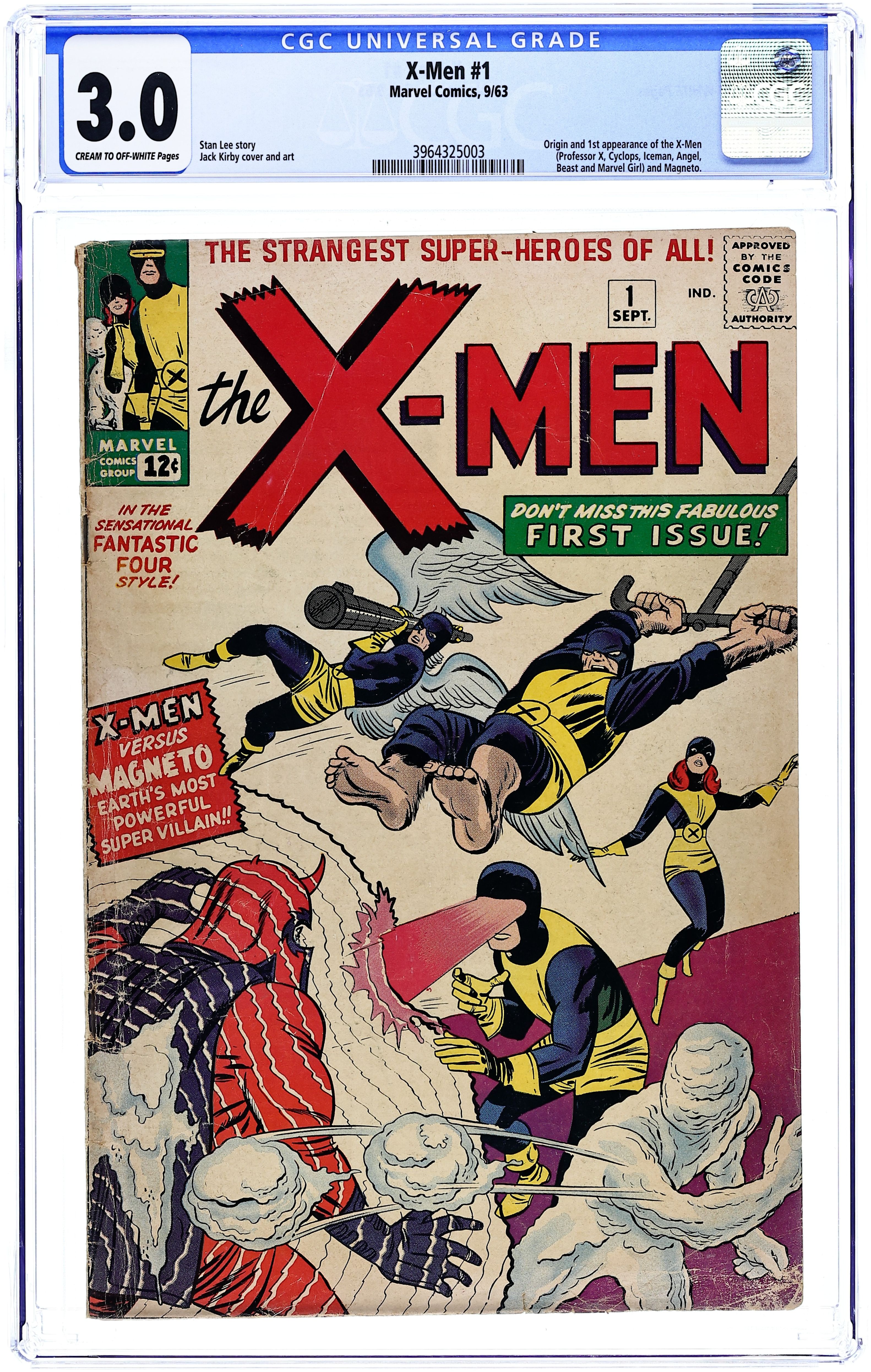 Cover pencils by Jack Kirby, inks by Sol Brodsky. X-Men, script by Stan Lee, pencils by Jack Kirby, inks by Paul Reinman; After a day of training and meeting Jean Grey, a new student at Professor X's school, the X-Men go one their first assignment--stopping a mutant named Magneto from talking over an Air Force base. Full page house ads for Amazing Spider-Man #4 and Sgt. Fury and His Howling Commandos #3. This is it, the first issue of the Uncanny X-Men, and even in the beginning, there was Magneto, the Earth's most powerful super villain. Conceived by Stan Lee and Jack Kirby, this first issue will always remain one of the core books within the Marvel Comics mythos. This is Stan and Jack making history and legend, although no one knew it at the time. First appearances of Professor X, Cyclops, Iceman, the Angel, the Beast, Marvel Girl, and Magneto. 36 pgs. $0.12. Cover price $0.12.