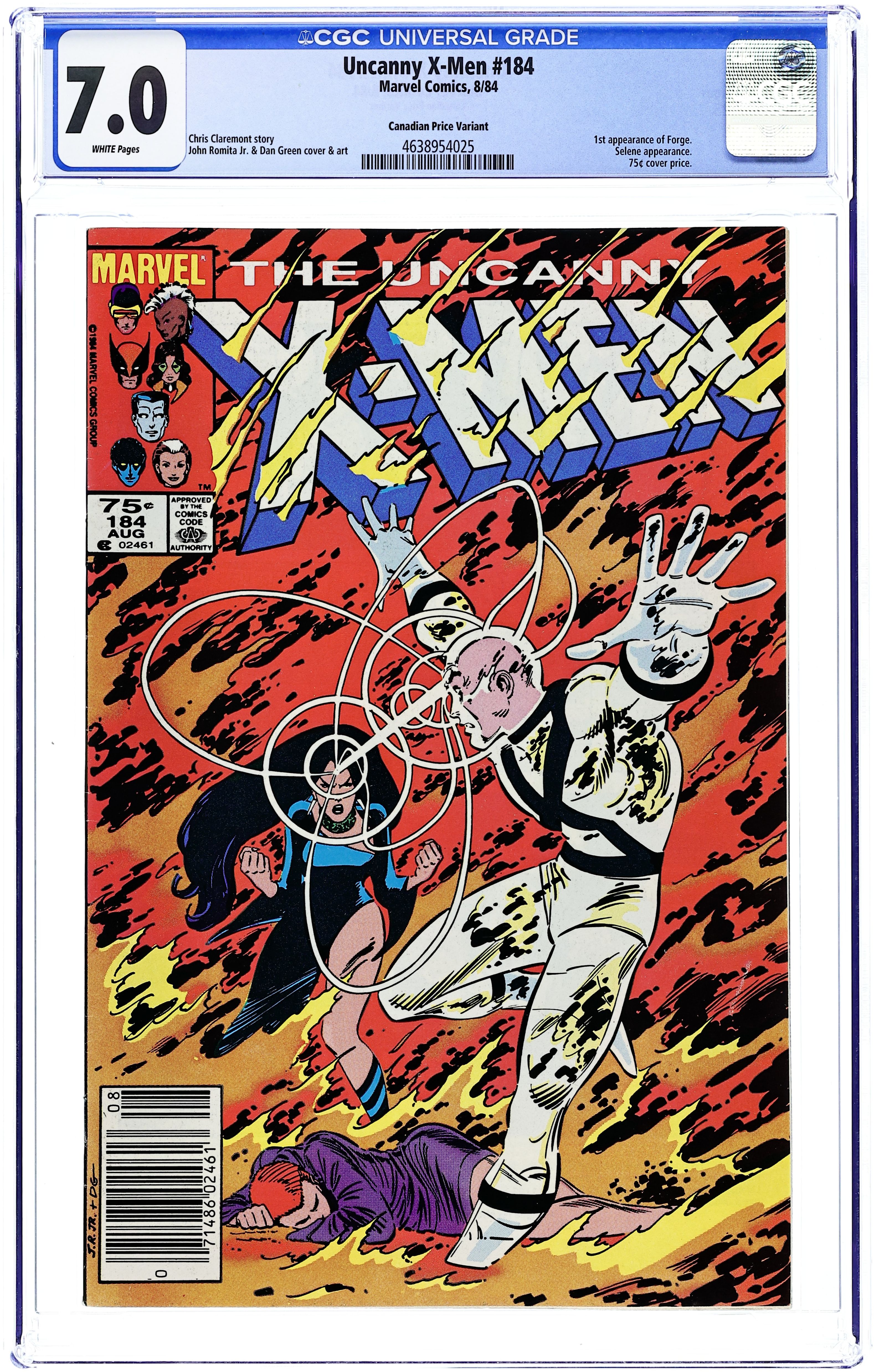 Canadian Edition with $.75 cover price. "The Past...of Future Days!" Story by Chris Claremont. Art by John Romita, Jr. and Dan Green. In light of the U.S. Government's passing of the Mutant Control Act, a weapon to deal with the situation is created by one of their own. Valerie Cooper and Raven Darkholme (a disguised Mystique) enlist the help of the man called Forge. Plus, Rachel Summers (last seen in the classic "Days of Future Past" storyline from Uncanny X-Men #141-142) has arrived in the present searching for the X-Men, but instead comes face-to-face with the psychic-vampire Selene! Note: First appearance of Forge. Cover price $0.75.