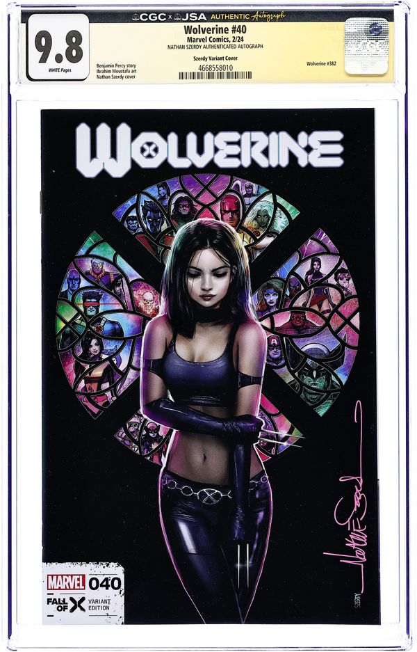 Comics Illuminati (Unknown Comics, Street Level Hero, Comic Traders, Anti-Hero Gallery, and The 616 Comics) Exclusive Virgin Cover by Nathan Szerdy. Written by Benjamin Percy. Art by Ibrahim Moustafa. STARK SENTINELS GET SPIDER-SENSES TINGLING! LAST MUTANT STANDING - FINALE! LOGAN's journey across the ORCHIS-controlled globe brings him to New York City - and a reunion with that great non-mutant super hero: SPIDER-MAN! But will the ol' PARKER LUCK help WOLVERINE against the wrath of the STARK SENTINELS or put the fall in FALL OF X?! 32 pages, full color. Rated Parental Advisory