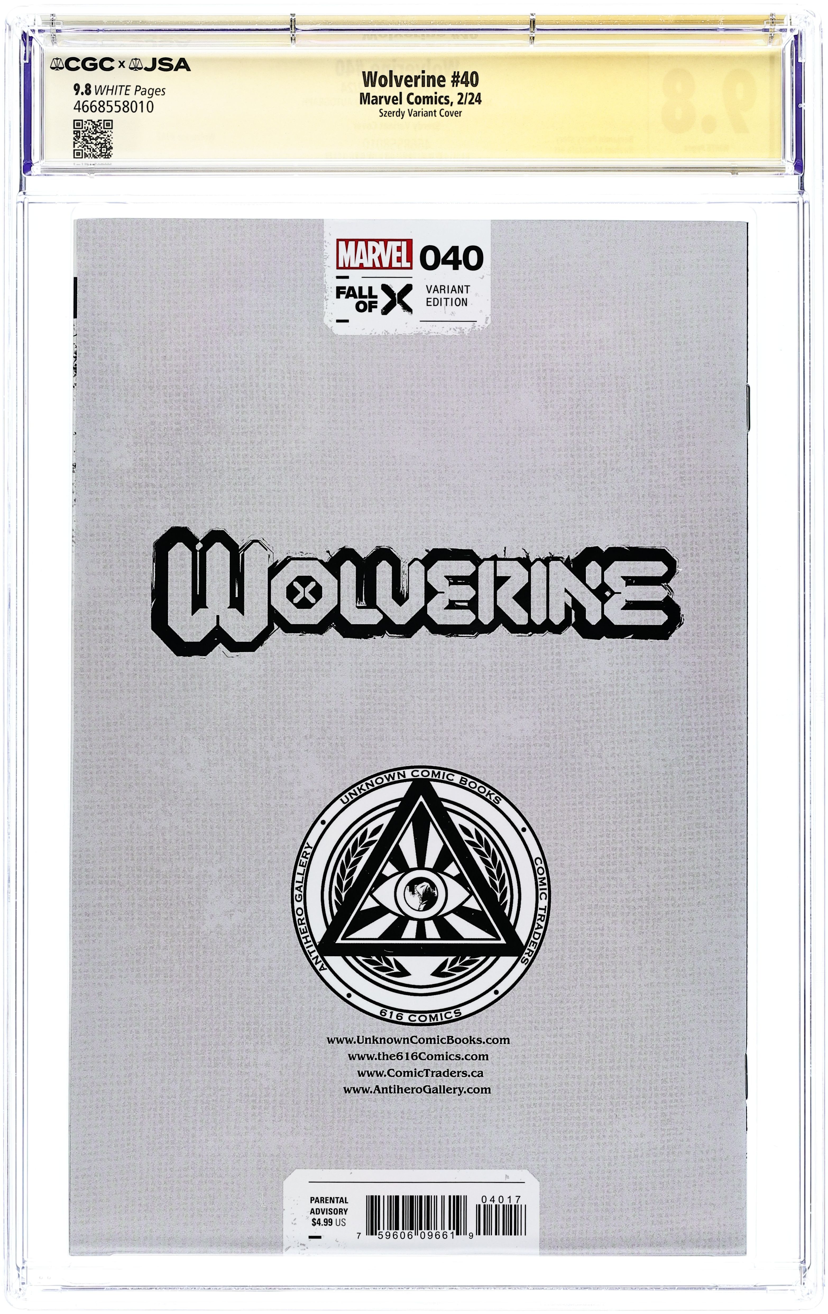 Comics Illuminati (Unknown Comics, Street Level Hero, Comic Traders, Anti-Hero Gallery, and The 616 Comics) Exclusive Variant Cover by Nathan Szerdy. Written by Benjamin Percy. Art by Ibrahim Moustafa. STARK SENTINELS GET SPIDER-SENSES TINGLING! LAST MUTANT STANDING - FINALE! LOGAN's journey across the ORCHIS-controlled globe brings him to New York City - and a reunion with that great non-mutant super hero: SPIDER-MAN! But will the ol' PARKER LUCK help WOLVERINE against the wrath of the STARK SENTINELS or put the fall in FALL OF X?! 32 pages, full color. Rated Parental Advisory