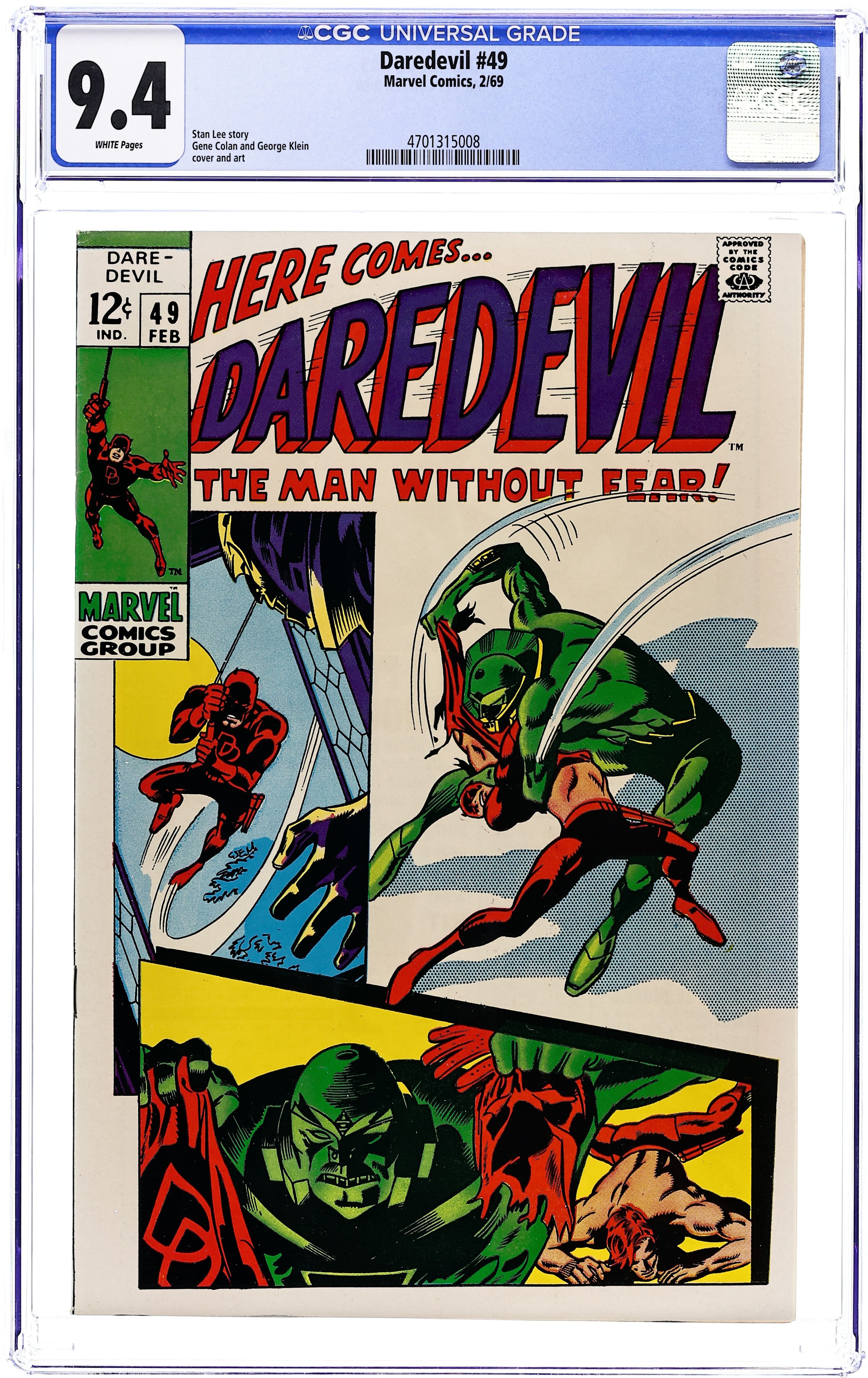 Cover pencils by Gene Colan, inks by Syd Shores. First appearance of the Stunt-Master in Spin-Out On Fifth Avenue, script by Roy Thomas, pencils by Gene Colan, inks by Syd Shores; Knowing that Matt is DD, Karen pressures him into give up his super-heroic lifestyle so they can be together; As DD is about to make a public announcement, Stunt-Master cycles in and crashes the party; Matt refuses to give up being Daredevil and Karen storms out. 36 pgs. Cover price $0.15. Cover price $0.15.