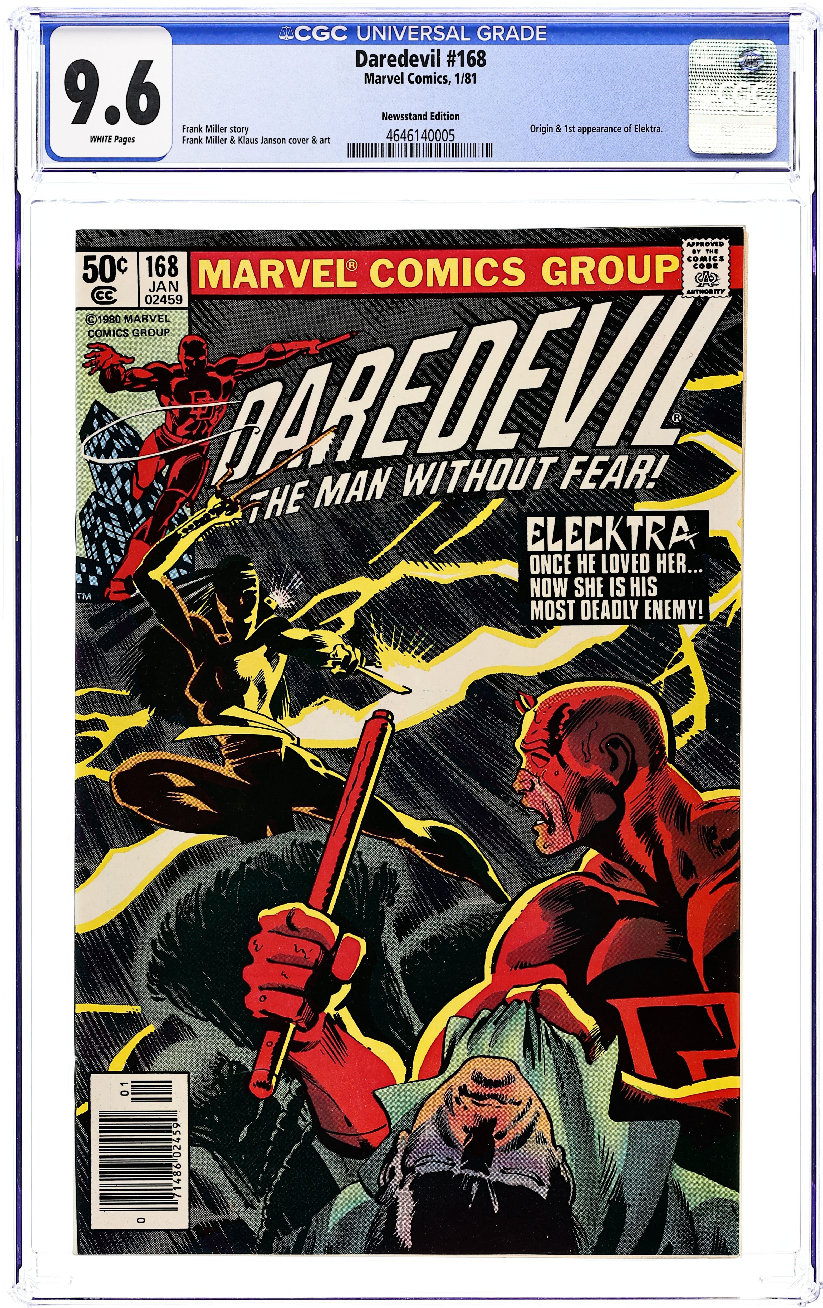 Ends Mar 30 7:57 PM CST Bid History 7 bids Current Bid $112 Your Secret Max Bid If you'd like to bid, please log in or register. Newsstand Edition. Cover pencils by Frank Miller, inks by Klaus Janson. First appearance of Elektra in Elektra, script by Frank Miller, pencils by Frank Miller (breakdowns) and Klaus Janson (finished art), inks by Klaus Janson; Matt is after an international criminal being protected by Eric Slaughter when he runs across his college sweetheart turned bounty hunter; this story, by the way, is a reworking of a couple of classic Spirit stories by Will Eisner, Sand Serif and Bring in Sand Serif (1950). 36 pgs. Cover price $0.50. Cover price $0.50.