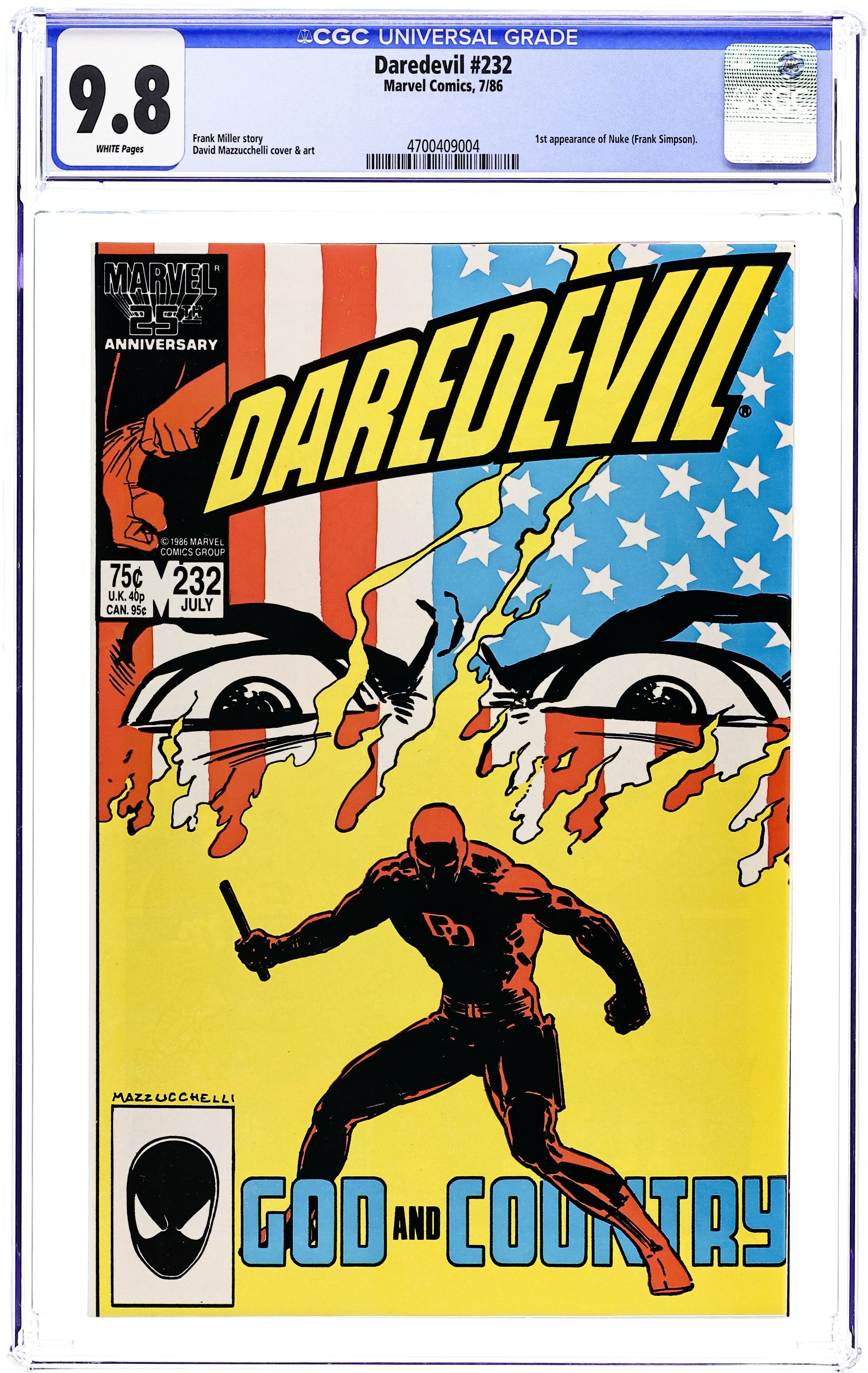 Direct Edition. Cover art by David Mazzucchelli. God and Country starring Daredevil, Karen Page, Foggy Nelson, Glorianna O'Breen, Ben Urich, Kingpin, and Nuke [Sgt. Simpson] (1st), script by Frank Miller, art by David Mazzucchelli; Matt helps Karen kick her drug habit; Kingpin hires a deranged Super Soldier to go after DD; part 6 of critically acclaimed Born Again storyline. 36 pgs. Cover price $0.75. Cover price $0.75.
